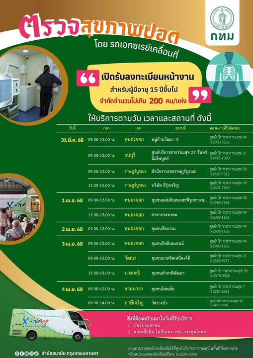 กรุงเทพมหานคร ให้บริการตรวจคัดกรองสุขภาพปอดโดยรถเอกซเรย์เคลื่อนที่ วันที่ 31 มี.ค. – 4 เม.ย. 68