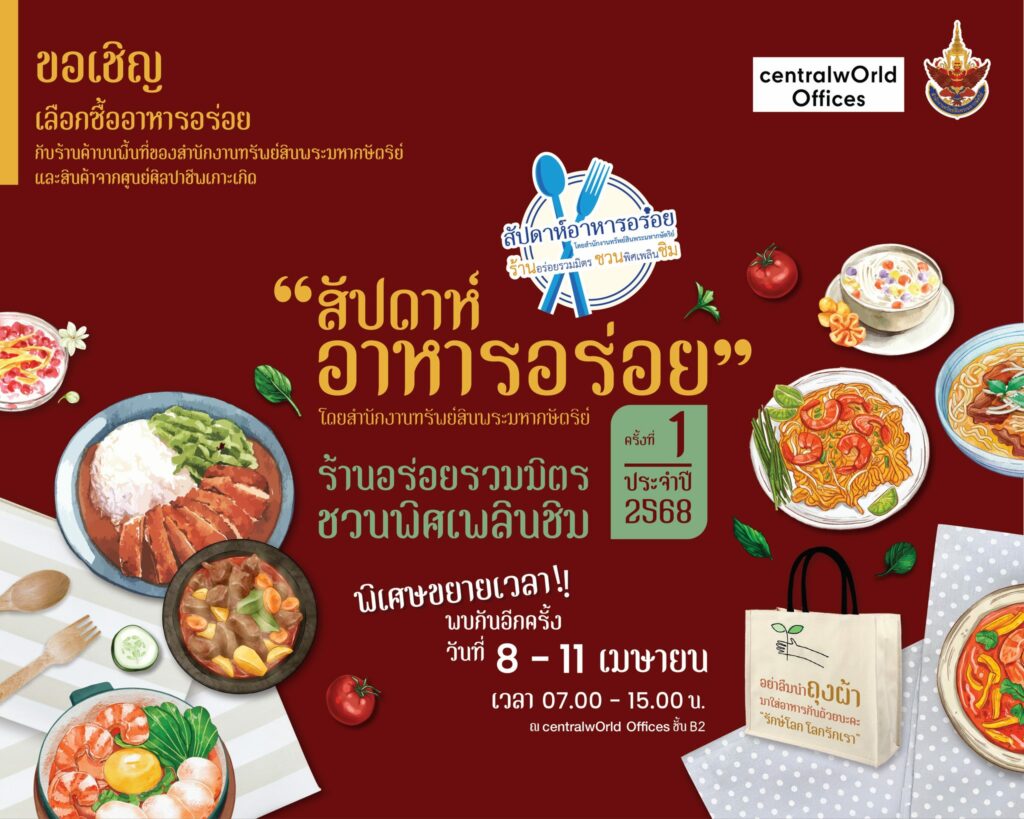 ขยายเวลาจัดงาน “สัปดาห์อาหารอร่อย” ครั้งที่ 1 ประจำปี 2568 ตั้งแต่วันที่ 8 – 11 เมษายน 2568 สำนักงานทรัพย์สินพระมหากษัตริย์ ร่วมกับ centralwOrld Offices ขอเชิญเลือกซื้ออาหารอร่อยหลากหลายนานาชนิดกับร้านค้าบนพื้นที่ของสำนักงานทรัพย์สินฯ และสินค้าจากศูนย์ศิลปาชีพเกาะเกิด ตั้งแต่วันที่ 8 – 11 เมษายน 2568 เวลา 07.00 – 15.00 น. ณ centralwOrld Offices ชั้น B2