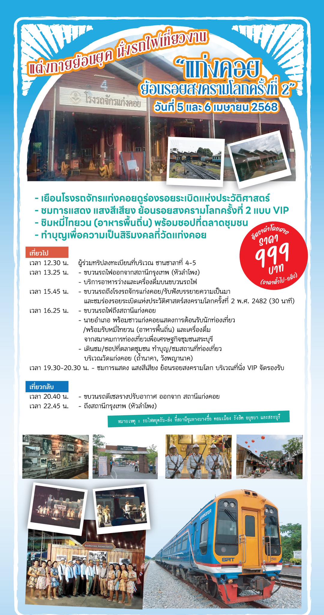 การรถไฟแห่งประเทศไทย เชิญชวนนั่งรถไฟ Sprinter แต่งกายย้อนยุค เที่ยวงาน “แก่งคอย ย้อนรอยสงครามโลกครั้งที่ 2” เฉพาะวันที่ 5 – 6 เมษายน 2568 เท่านั้น ด้วยแพ็กเกจพิเศษเพียง 999 บาท เปิดจองตั๋วแล้วตั้งแต่บัดนี้เป็นต้นไป ณ สถานีรถไฟทั่วประเทศ หรือผ่านระบบออนไลน์ D-Ticket ที่นั่งมีจำนวนจำกัด