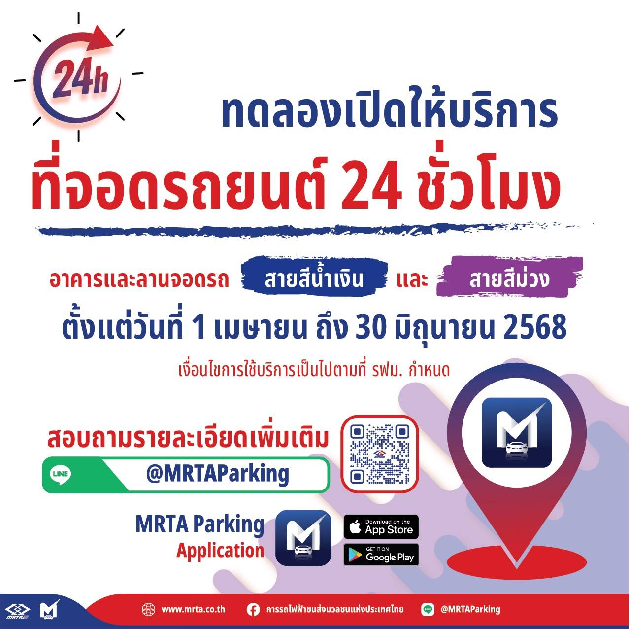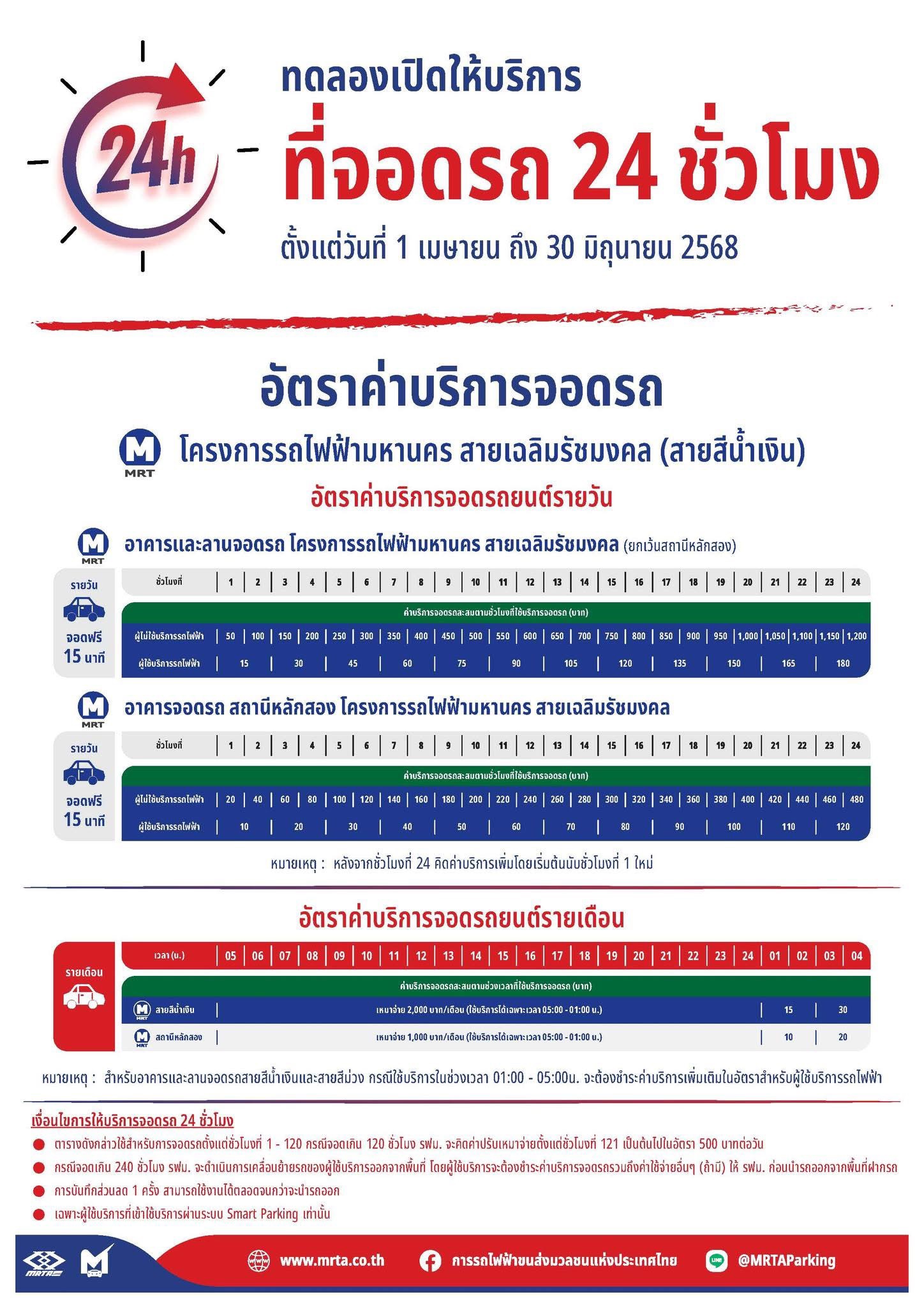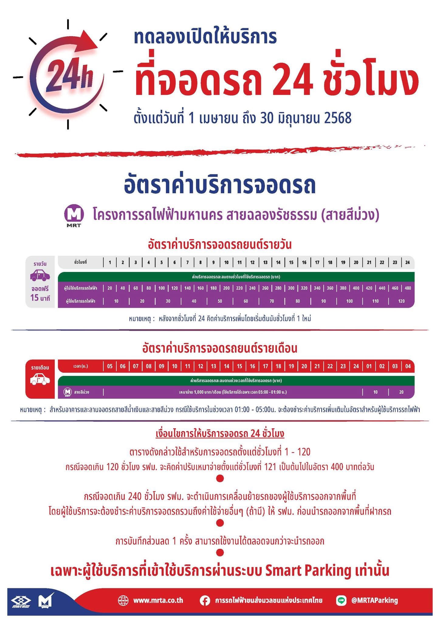 การรถไฟฟ้าขนส่งมวลชนแห่งประเทศไทย เปิดทดลองการให้บริการจอดรถ 24 ชั่วโมง บริเวณอาคารและลานจอดรถ โครงการรถไฟฟ้ามหานคร สายเฉลิมรัชมงคล และสายฉลองรัชธรรม ตั้งแต่วันที่ 1 เมษายน – 30 มิถุนายน 2568