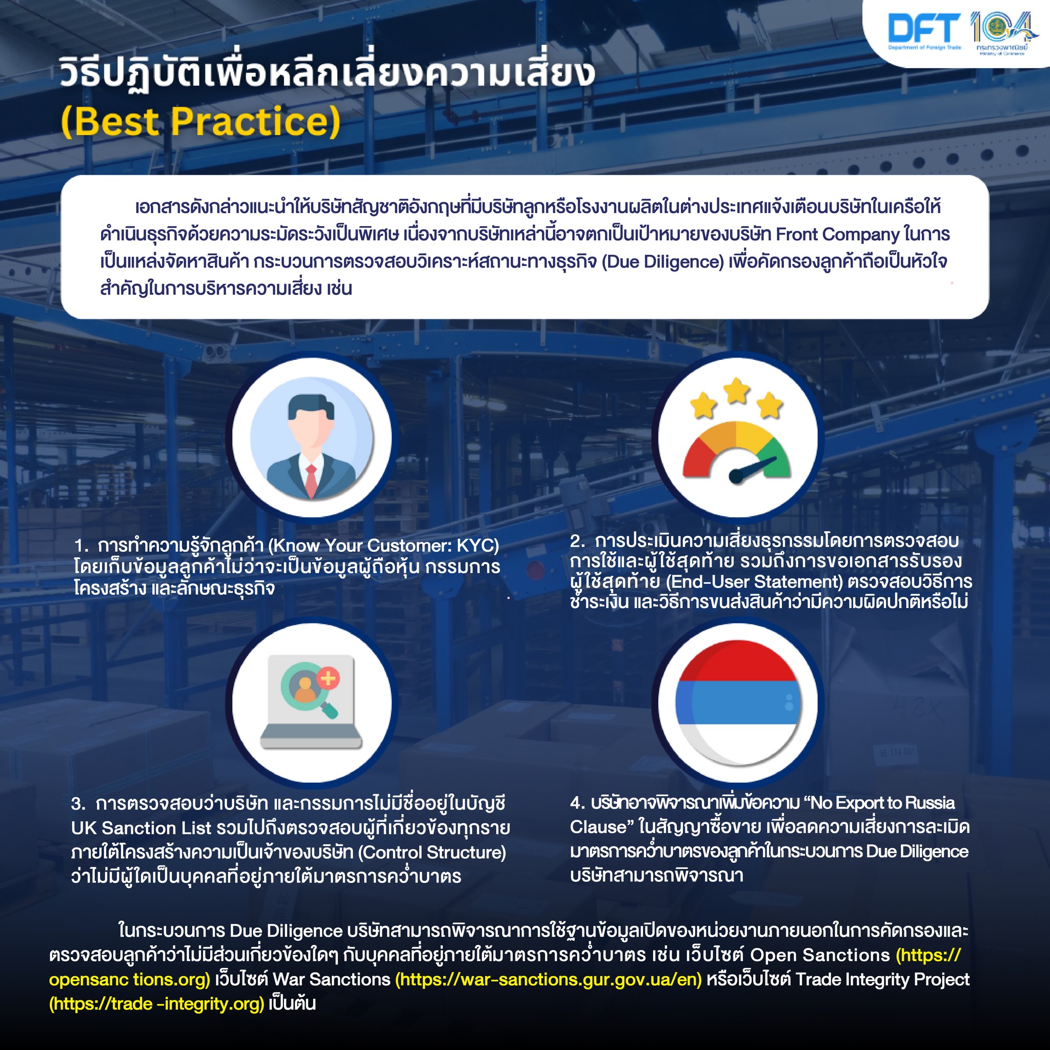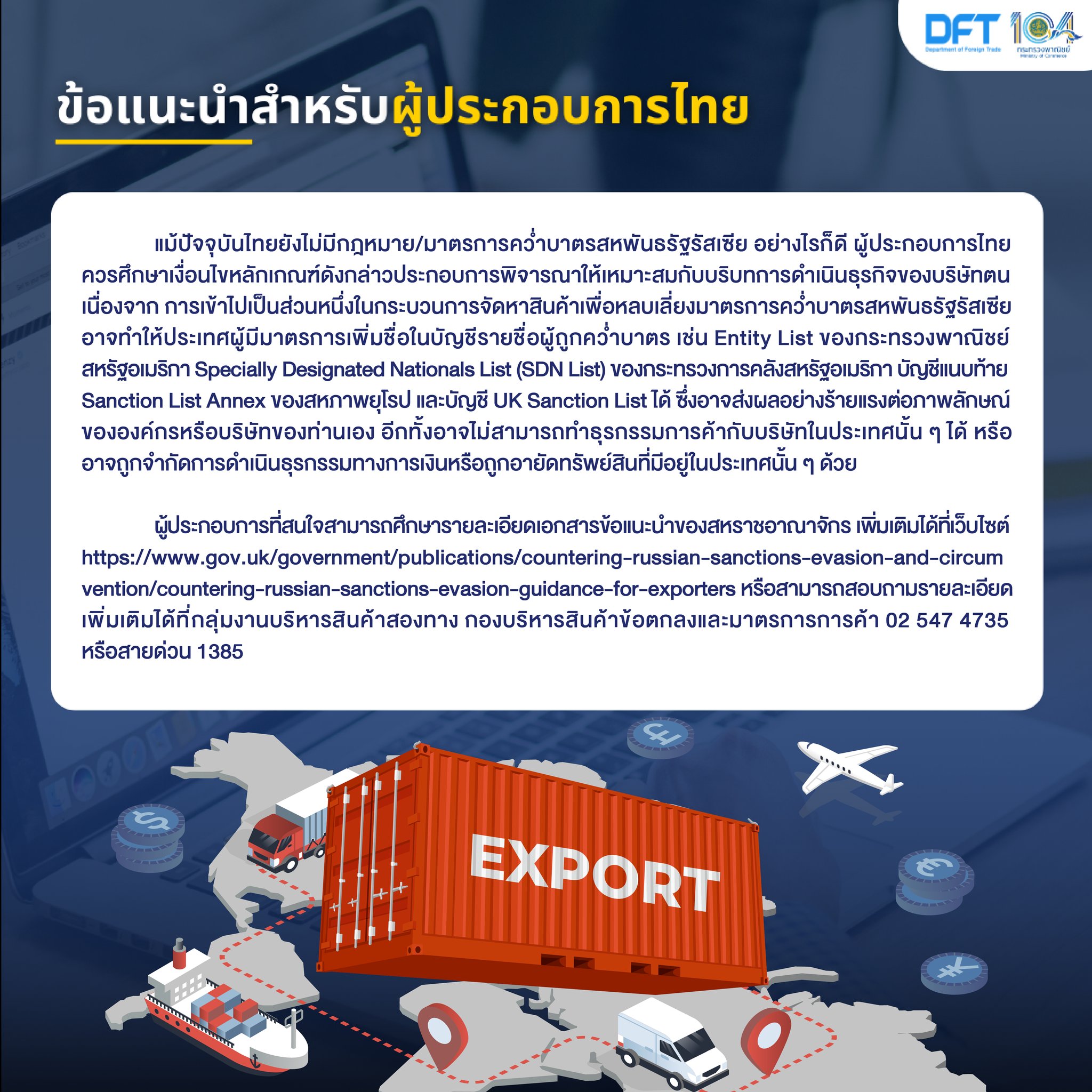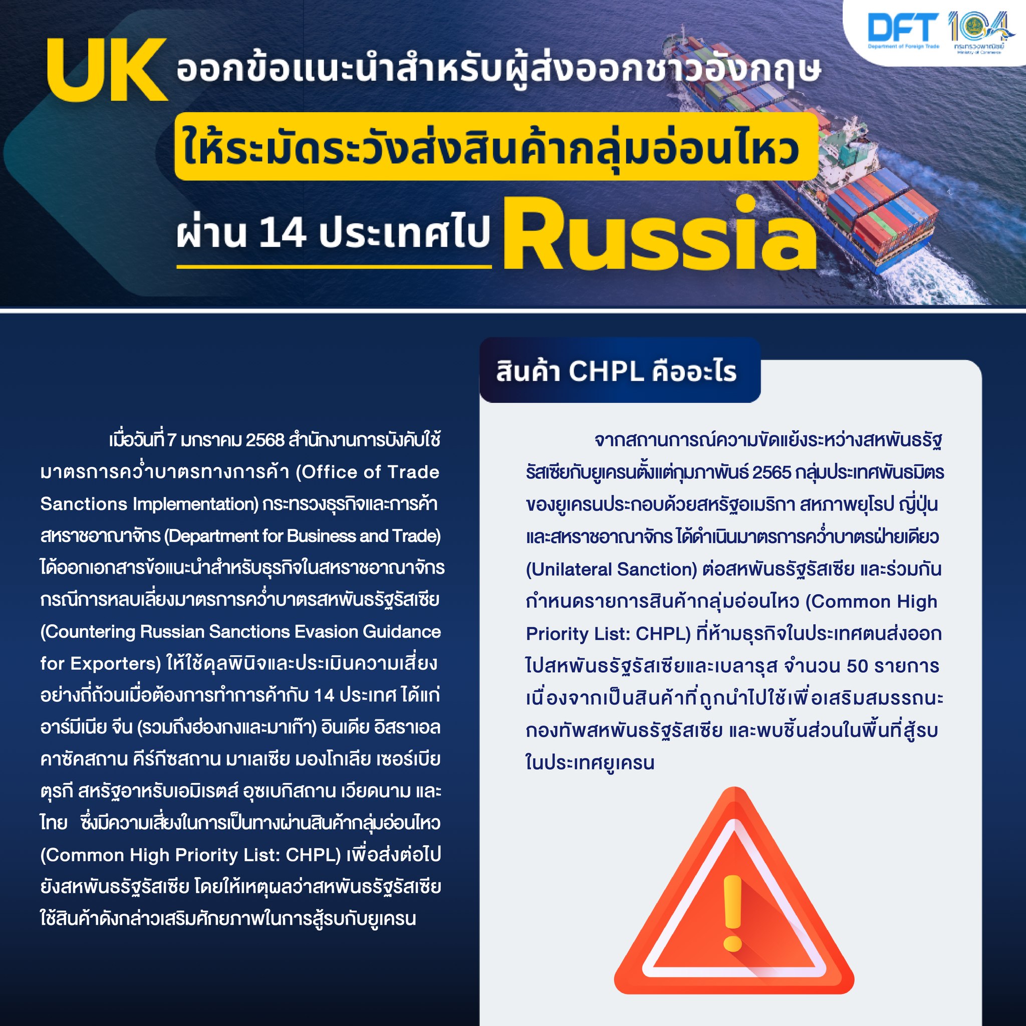 รู้หรือไม่ เมื่อวันที่ 7 มกราคม 2568 สำนักงานการบังคับใช้มาตรการคว่ำบาตรทางการค้า (Office of Trade Sanctions Implementation) กระทรวงธุรกิจและการค้าสหราชอาณาจักร (Department for Business and Trade) ได้ออกเอกสารข้อแนะนำสำหรับธุรกิจในสหราชอาณาจักรกรณีการหลบเลี่ยงมาตรการคว่ำบาตรสหพันธรัฐรัสเซีย (Countering Russian Sanctions Evasion Guidance for Exporters) ให้ใช้ดุลพินิจและประเมินความเสี่ยงอย่างถี่ถ้วนเมื่อต้องการทำการค้ากับ 14 ประเทศ ได้แก่ อาร์มีเนีย จีน (รวมถึงฮ่องกงและมาเก๊า) อินเดีย อิสราเอล คาซัคสถาน คีร์กีซสถาน มาเลเซีย มองโกเลีย เซอร์เบีย ตุรกี สหรัฐอาหรับเอมิเรตส์ อุซเบกิสถาน เวียดนาม และไทย ซึ่งมีความเสี่ยงในการเป็นทางผ่านสินค้ากลุ่มอ่อนไหว (Common High Priority List: CHPL) เพื่อส่งต่อไปยังสหพันธรัฐรัสเซีย โดยให้เหตุผลว่าสหพันธรัฐรัสเซียใช้สินค้าดังกล่าวเสริมศักยภาพในการสู้รบกับยูเครน