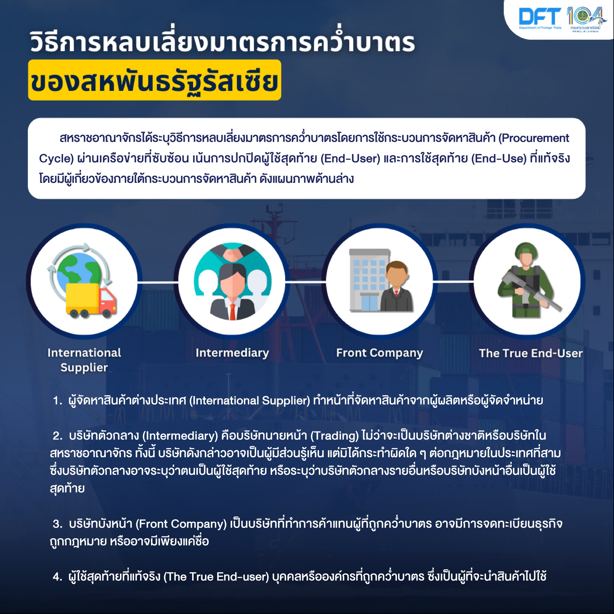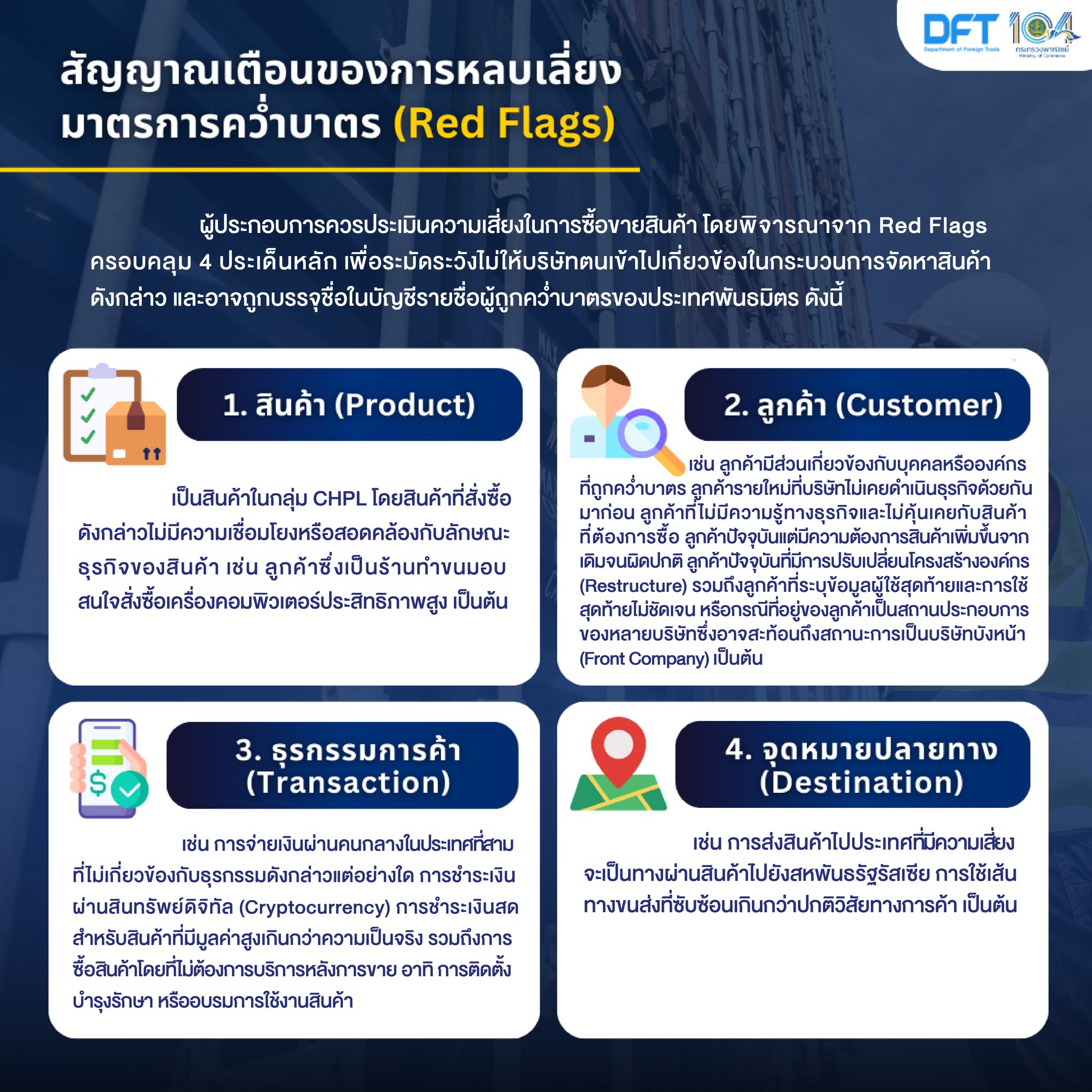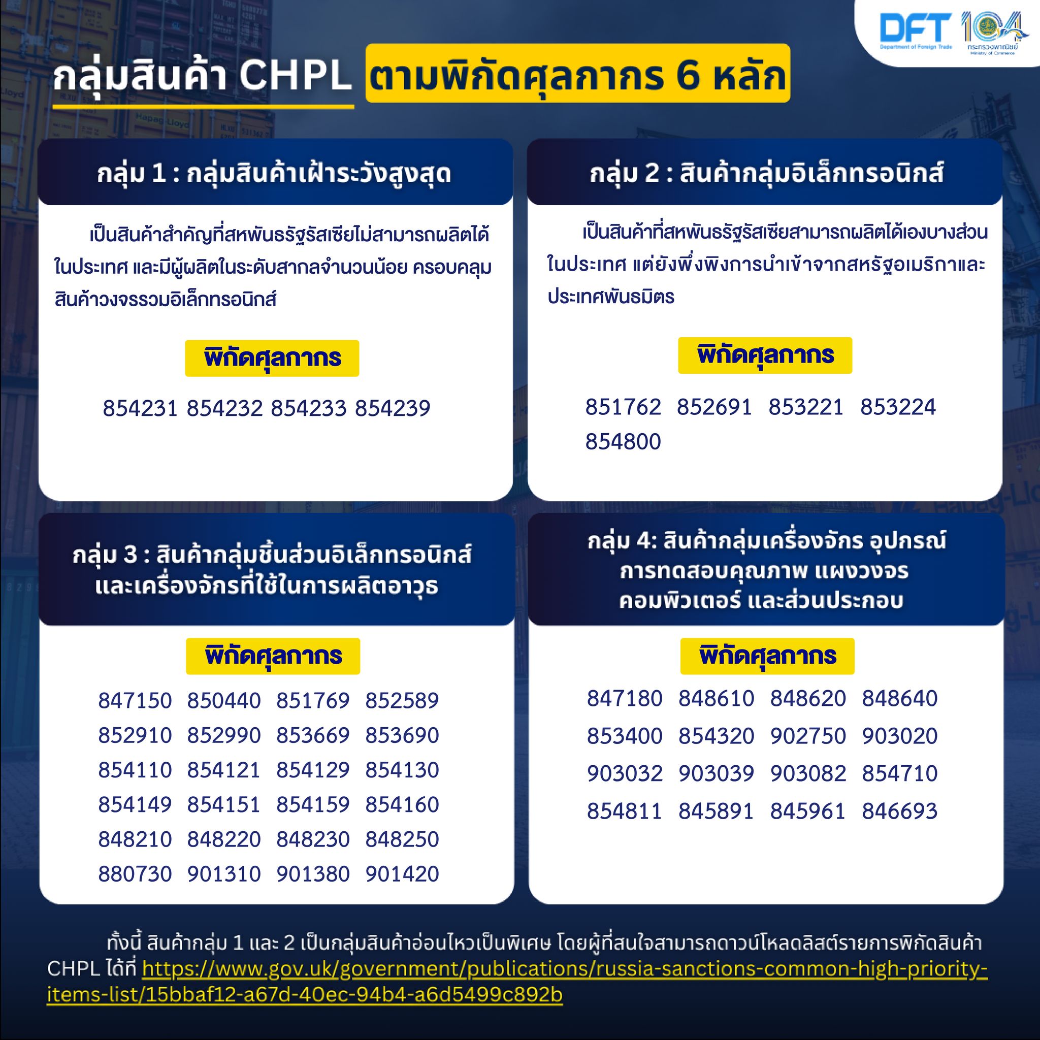 รู้หรือไม่ เมื่อวันที่ 7 มกราคม 2568 สำนักงานการบังคับใช้มาตรการคว่ำบาตรทางการค้า (Office of Trade Sanctions Implementation) กระทรวงธุรกิจและการค้าสหราชอาณาจักร (Department for Business and Trade) ได้ออกเอกสารข้อแนะนำสำหรับธุรกิจในสหราชอาณาจักรกรณีการหลบเลี่ยงมาตรการคว่ำบาตรสหพันธรัฐรัสเซีย (Countering Russian Sanctions Evasion Guidance for Exporters) ให้ใช้ดุลพินิจและประเมินความเสี่ยงอย่างถี่ถ้วนเมื่อต้องการทำการค้ากับ 14 ประเทศ ได้แก่ อาร์มีเนีย จีน (รวมถึงฮ่องกงและมาเก๊า) อินเดีย อิสราเอล คาซัคสถาน คีร์กีซสถาน มาเลเซีย มองโกเลีย เซอร์เบีย ตุรกี สหรัฐอาหรับเอมิเรตส์ อุซเบกิสถาน เวียดนาม และไทย ซึ่งมีความเสี่ยงในการเป็นทางผ่านสินค้ากลุ่มอ่อนไหว (Common High Priority List: CHPL) เพื่อส่งต่อไปยังสหพันธรัฐรัสเซีย โดยให้เหตุผลว่าสหพันธรัฐรัสเซียใช้สินค้าดังกล่าวเสริมศักยภาพในการสู้รบกับยูเครน