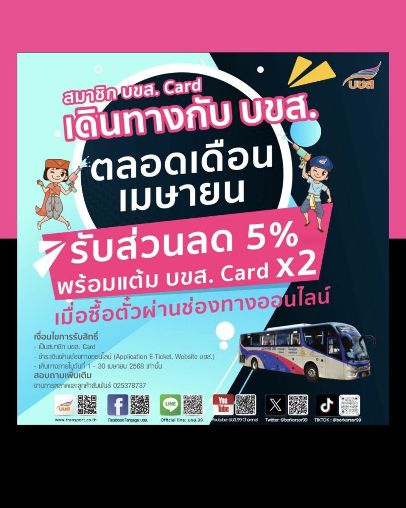 บริษัท ขนส่ง จำกัด จัดโปรโมชั่นเดือนเมษายน 2568 นั่งรถ บขส. รับแต้ม X2 สมาชิก บขส. Card เพียงจองตั๋วออนไลน์ เลือกเดินทางระหว่างวันที่ 1 – 30 เมษายน 2568 รับส่วนลดค่าโดยสาร 5% พร้อมรับแต้ม X2
