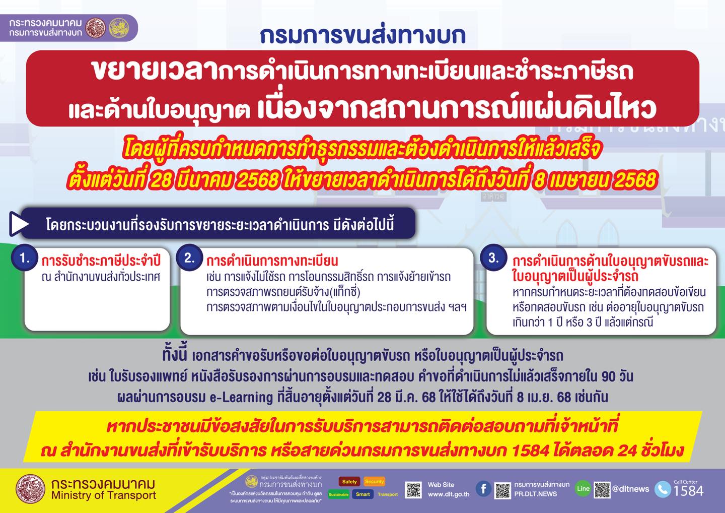 กรมการขนส่งทางบก ขยายเวลาการดำเนินการทางทะเบียนและชำระภาษีรถ และด้านใบอนุญาต เนื่องจากสถานการณ์แผ่นดินไหว โดยผู้ที่ครบกำหนดการทำธุรกรรมและต้องดำเนินการให้แล้วเสร็จตั้งแต่วันที่ 28 มีนาคม 2568 ให้ขยายเวลาดำเนินการได้ถึงวันที่ 8 เมษายน 2568