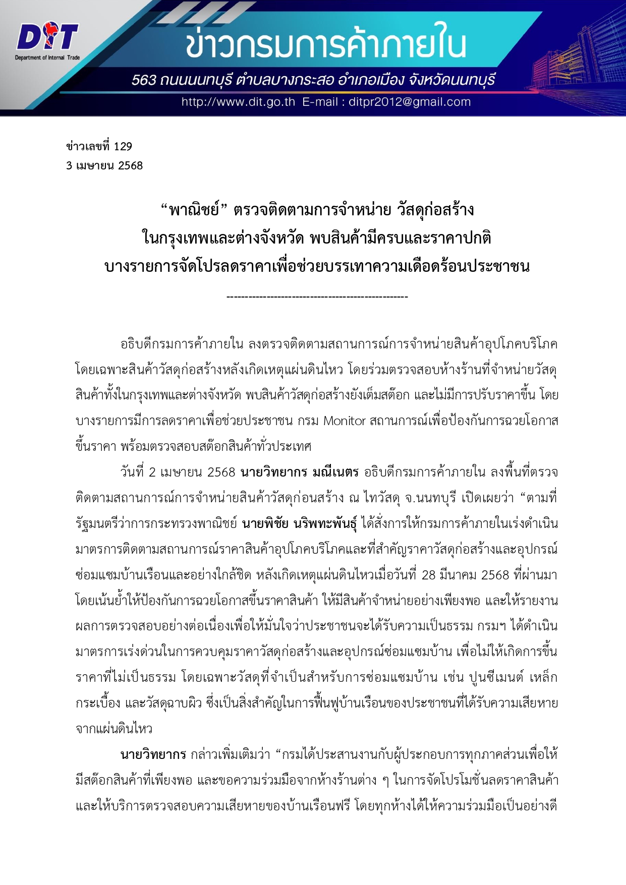 อธิบดีกรมการค้าภายใน ลงตรวจติดตามสถานการณ์การจำหน่ายสินค้าอุปโภคบริโภค โดยเฉพาะสินค้าวัสดุก่อสร้างหลังเกิดเหตุแผ่นดินไหว โดยร่วมตรวจสอบห้างร้านที่จำหน่ายวัสดุ สินค้าทั้งในกรุงเทพและต่างจังหวัด พบสินค้าวัสดุก่อสร้างยังเต็มสต๊อก และไม่มีการปรับราคาขึ้น โดย บางรายการมีการลดราคาเพื่อช่วยประชาชน กรม Monitor สถานการณ์เพื่อป้องกันการฉวยโอกาส ขึ้นราคา พร้อมตรวจสอบสต๊อกสินค้าทั่วประเทศ