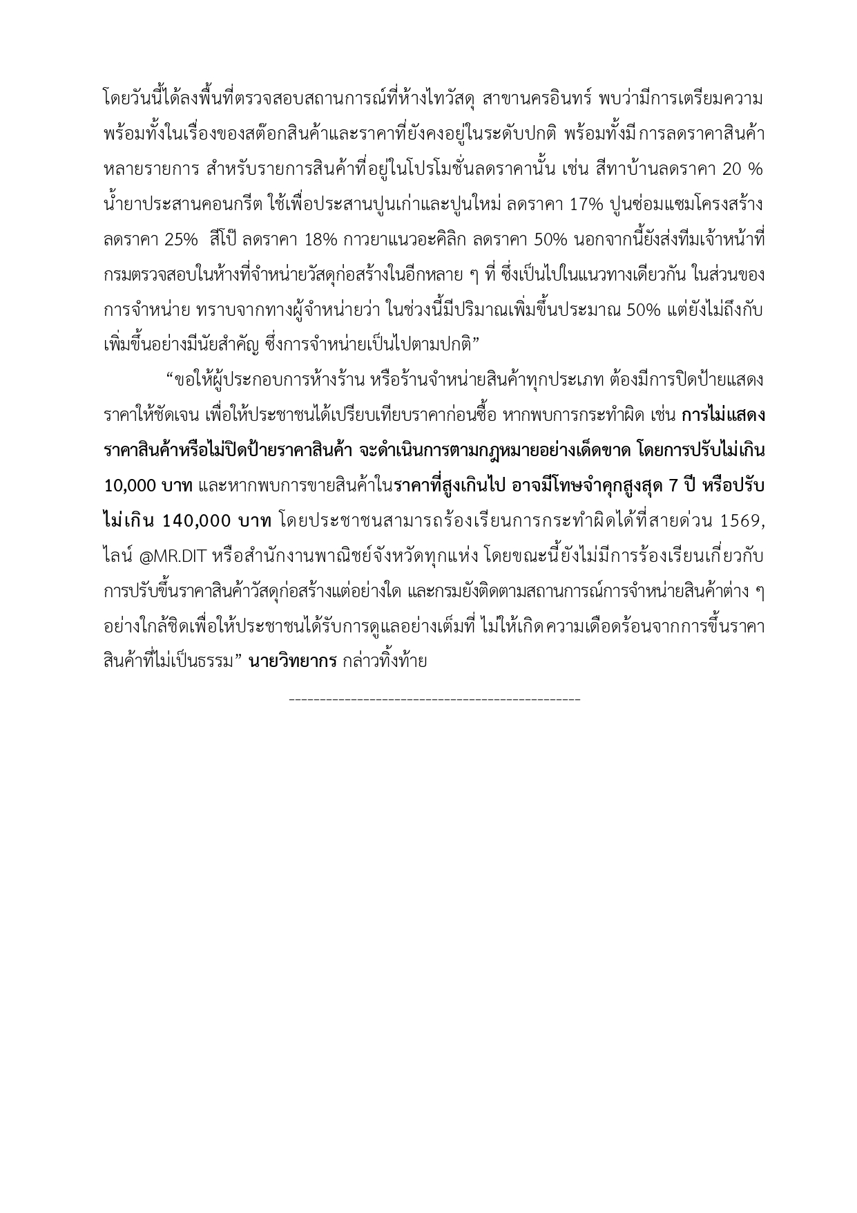 “ขอให้ผู้ประกอบการห้างร้าน หรือร้านจำหน่ายสินค้าทุกประเภท ต้องมีการปิดป้ายแสดง ราคาให้ชัดเจน เพื่อให้ประชาชนได้เปรียบเทียบราคาก่อนซื้อ หากพบการกระทำผิด เช่น การไม่แสดง ราคาสินค้าหรือไม่ปิดป้ายราคาสินค้า จะดำเนินการตามกฎหมายอย่างเด็ดขาด โดยการปรับไม่เกิน 10,000 บาท และหากพบการขายสินค้าในราคาที่สูงเกินไป อาจมีโทษจำคุกสูงสุด 7 ปี หรือปรับ ไม่เกิน 140,000 บาท โดยประชาชนสามารถร้องเรียนการกระทำผิดได้ที่สายด่วน 1569, ไลน์ @MR.DIT หรือสำนักงานพาณิชย์จังหวัดทุกแห่ง โดยขณะนี้ยังไม่มีการร้องเรียนเกี่ยวกับ การปรับขึ้นราคาสินค้าวัสดุก่อสร้างแต่อย่างใด และกรมยังติดตามสถานการณ์การจำหน่ายสินค้าต่าง ๆ อย่างใกล้ชิดเพื่อให้ประชาชนได้รับการดูแลอย่างเต็มที่ ไม่ให้เกิดความเดือดร้อนจากการขึ้นราคา สินค้าที่ไม่เป็นธรรม” นายวิทยากร กล่าวทิ้งท้าย