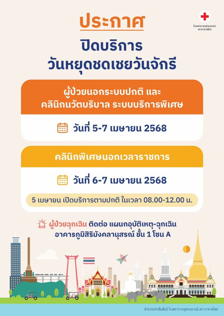 โรงพยาบาลจุฬาลงกรณ์ สภากาชาดไทย แจ้งปิดบริการวันหยุดชดเชยวันจักรี ข่าวสารกิจกรรม โรงพยาบาลจุฬาลงกรณ์ สภากาชาดไทย แจ้งปิดบริการวันหยุดชดเชยวันจักรี โรงพยาบาลจุฬาลงกรณ์ สภากาชาดไทย แจ้งปิดบริการวันหยุดชดเชยวันจักรี ผู้ป่วยนอกระบบปกติ และคลินิกนวัตบริบาล ระบบบริการพิเศษปิดบริการ วันที่ 5 – 7 เมษายน 2568คลินิกพิเศษนอกเวลาราชการปิดบริการ วันที่ 6 – 7 เมษายน 2568วันที่ 5 เมษายน เปิดบริการตามปกติ เวลา 08.00 – 12.00 น.ทั้งนี้ ผู้ป่วยฉุกเฉิน ติดต่อ แผนกอุบัติเหตุ-ฉุกเฉิน อาคารภูมิสิริมังคลานุสรณ์ ชั้น 1 โซน A ที่มา : https://citly.me/xNwM1 Post Views: 7 FacebookFacebookXTwitterLINELine