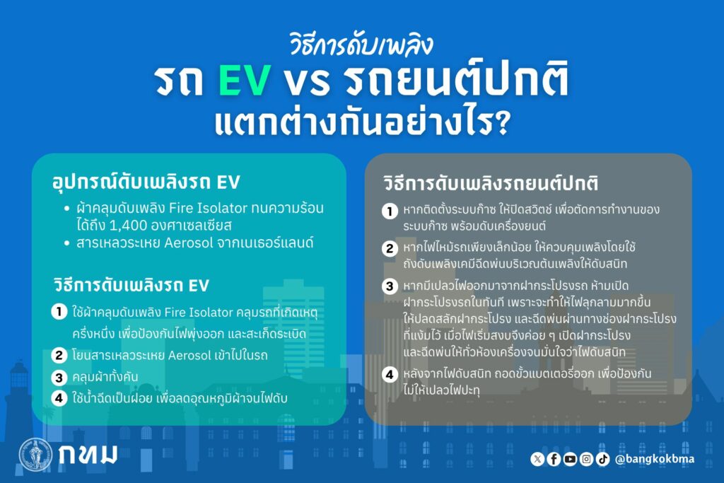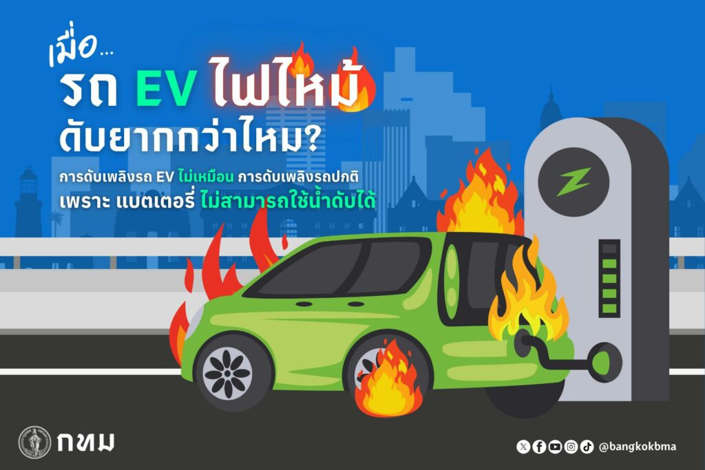รถไฟฟ้า EV หากเกิดเพลิงไหม้ จะดับไฟได้ยากกว่ารถยนต์ปกติ เพราะแบตเตอรี่ของตัวรถไม่สามารถใช้น้ำดับได้ กทม. อยากให้ประชาชนทราบ เพื่อตอบรับเทรนด์รถไฟฟ้า EV ที่กำลังได้รับความนิยมขึ้น โดยหากเกิดเหตุเพลิงไหม้ ผู้ใช้รถจะได้มีความรู้ และแก้ปัญหาได้อย่างถูกต้อง