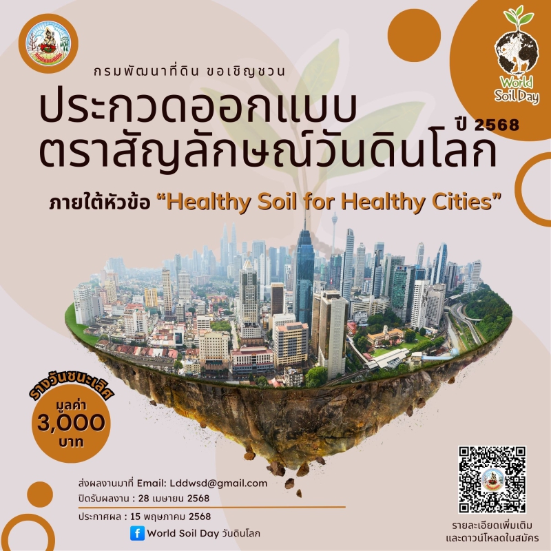 กรมพัฒนาที่ดิน ขอเชิญชวนส่งผลงานเข้าร่วมการประกวดคำขวัญ (ภาษาไทย) และ/หรือ ออกแบบตราสัญลักษณ์ วันดินโลก ปี 2568 ในหัวข้อ “Healthy Soil for Healthy Cities” ชิงเงินรางวัลมูลค่ารวม 6,000 บาท