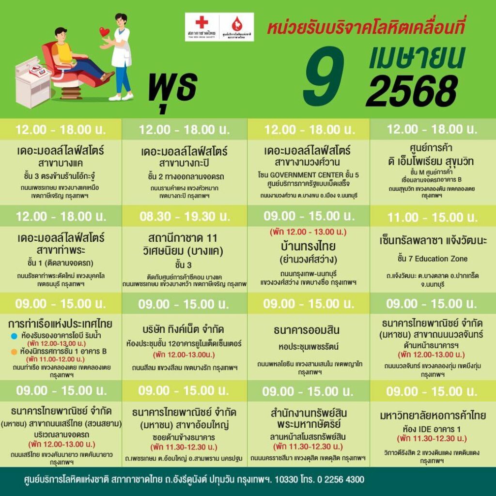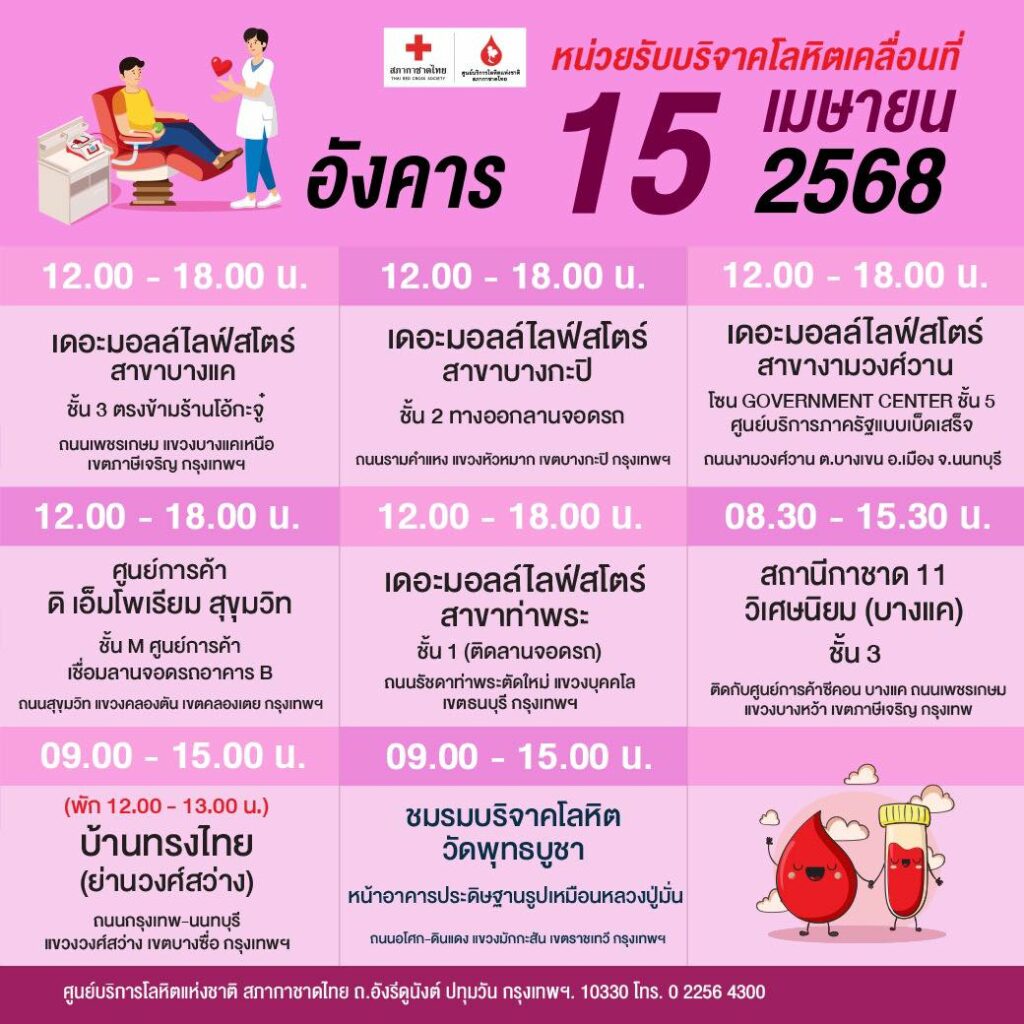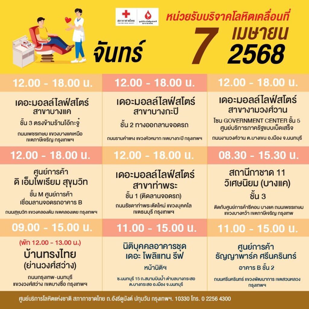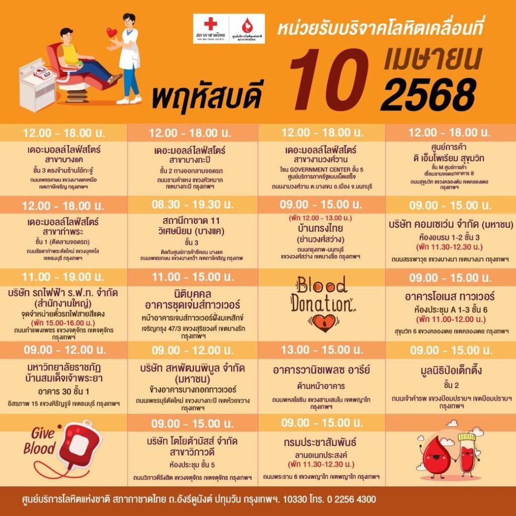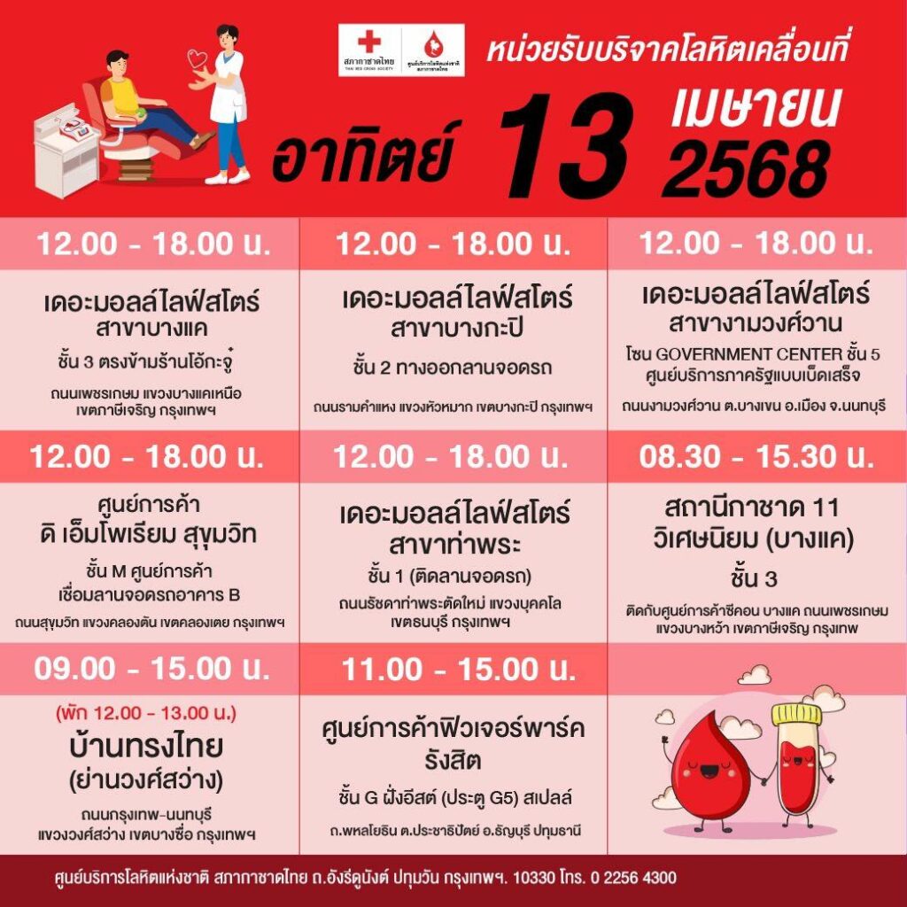 สภากาชาดไทย ออกหน่วยรับบริจาคโลหิตเคลื่อนที่ วันที่ 7 – 16 เมษายน 2568