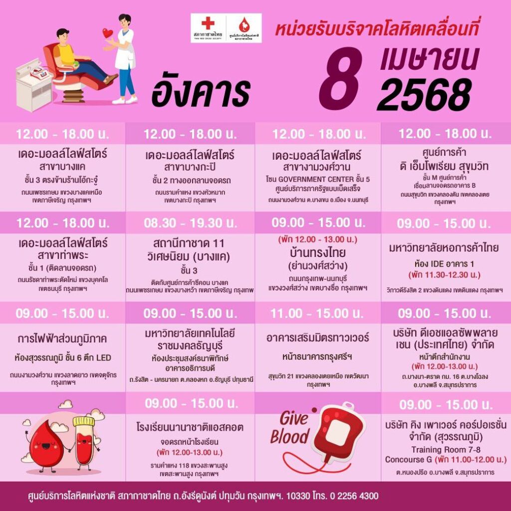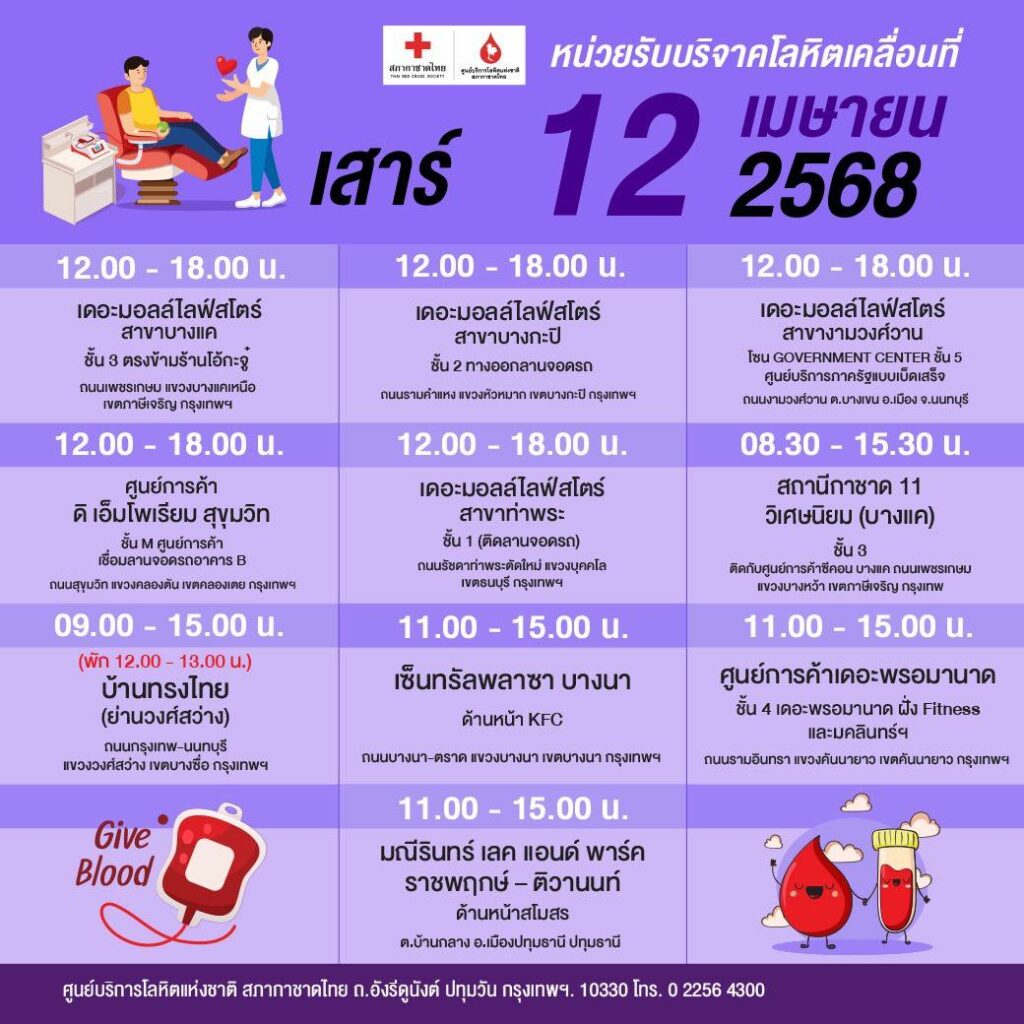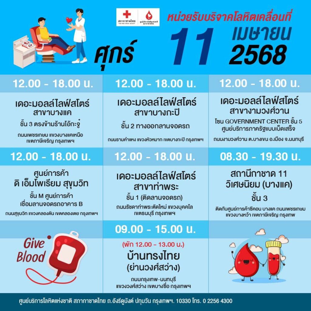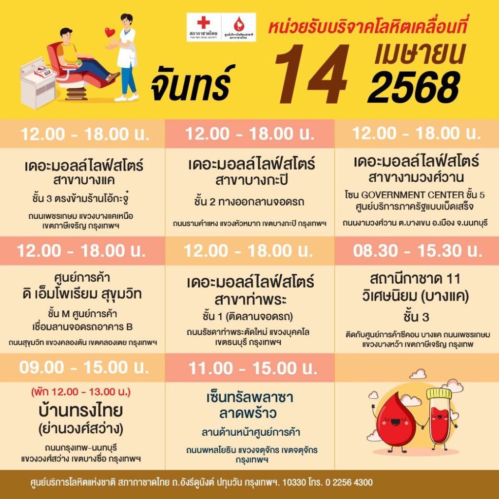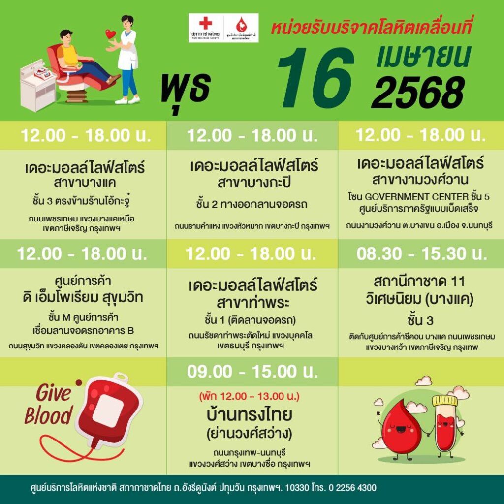สภากาชาดไทย ออกหน่วยรับบริจาคโลหิตเคลื่อนที่ วันที่ 7 – 16 เมษายน 2568