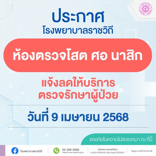 โรงพยาบาลราชวิถี แจ้ง “ห้องตรวจโสต ศอ นาสิก” ลดให้บริการตรวจรักษาผู้ป่วย วันที่ 9 เมษายน 2568 ข่าวสารกิจกรรม โรงพยาบาลราชวิถี แจ้ง “ห้องตรวจโสต ศอ นาสิก” ลดให้บริการตรวจรักษาผู้ป่วย วันที่ 9 เมษายน 2568 โรงพยาบาลราชวิถี แจ้ง “ห้องตรวจโสต ศอ นาสิก” ลดให้บริการตรวจรักษาผู้ป่วยในวันที่ 9 เมษายน 2568 ที่มา : https://citly.me/APrLT Post Views: 12 FacebookFacebookXTwitterLINELine