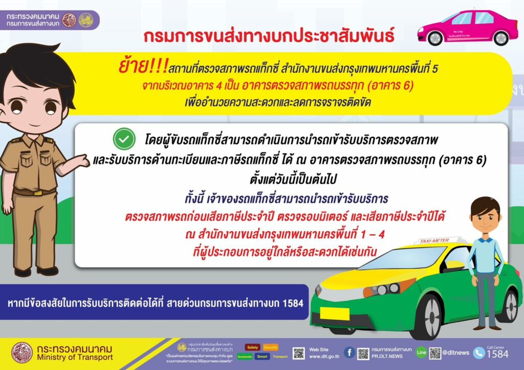 กรมการขนส่งทางบก แจ้งย้ายสถานที่ตรวจสภาพรถแท็กซี่ สำนักงานขนส่งกรุงเทพมหานครพื้นที่ 5