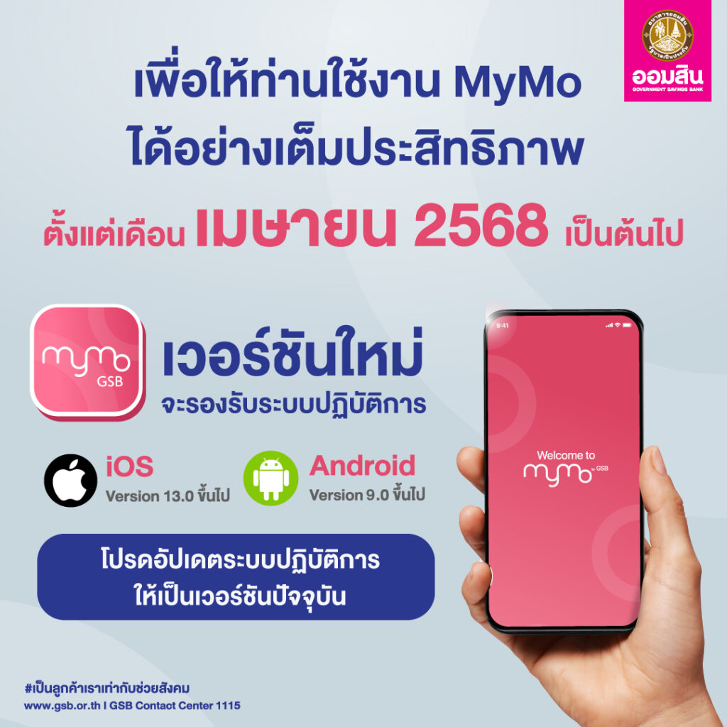 ธนาคารออมสิน แจ้งเตือน MyMo เวอร์ชันใหม่จะรองรับระบบปฏิบัติการ IOS V. 13.0 และ Android V. 9.0 ขึ้นไป ข่าวสารกิจกรรม ธนาคารออมสิน แจ้งเตือน MyMo เวอร์ชันใหม่จะรองรับระบบปฏิบัติการ IOS V. 13.0 และ Android V. 9.0 ขึ้นไป ธนาคารออมสิน แจ้งเตือน MyMo เวอร์ชันใหม่จะรองรับระบบปฏิบัติการ IOS Version 13.0 ขึ้นไป และ Android Version 9.0 ขึ้นไป ตั้งแต่เดือนเมษายน 2568 เป็นต้นไป ทั้งนี้ เพื่อให้การใช้งาน MyMo เป็นไปอย่างเต็มประสิทธิภาพ โปรดอัปเดตระบบปฏิบัติการบนโทรศัพท์มือถือของท่านให้เป็นเวอร์ชันปัจจุบัน สามารถโหลด MyMo ได้เลยที่ App Store, Play Store, และ AppGallery ที่มา : https://citly.me/FAUoK Post Views: 176 FacebookFacebookXTwitterLINELine