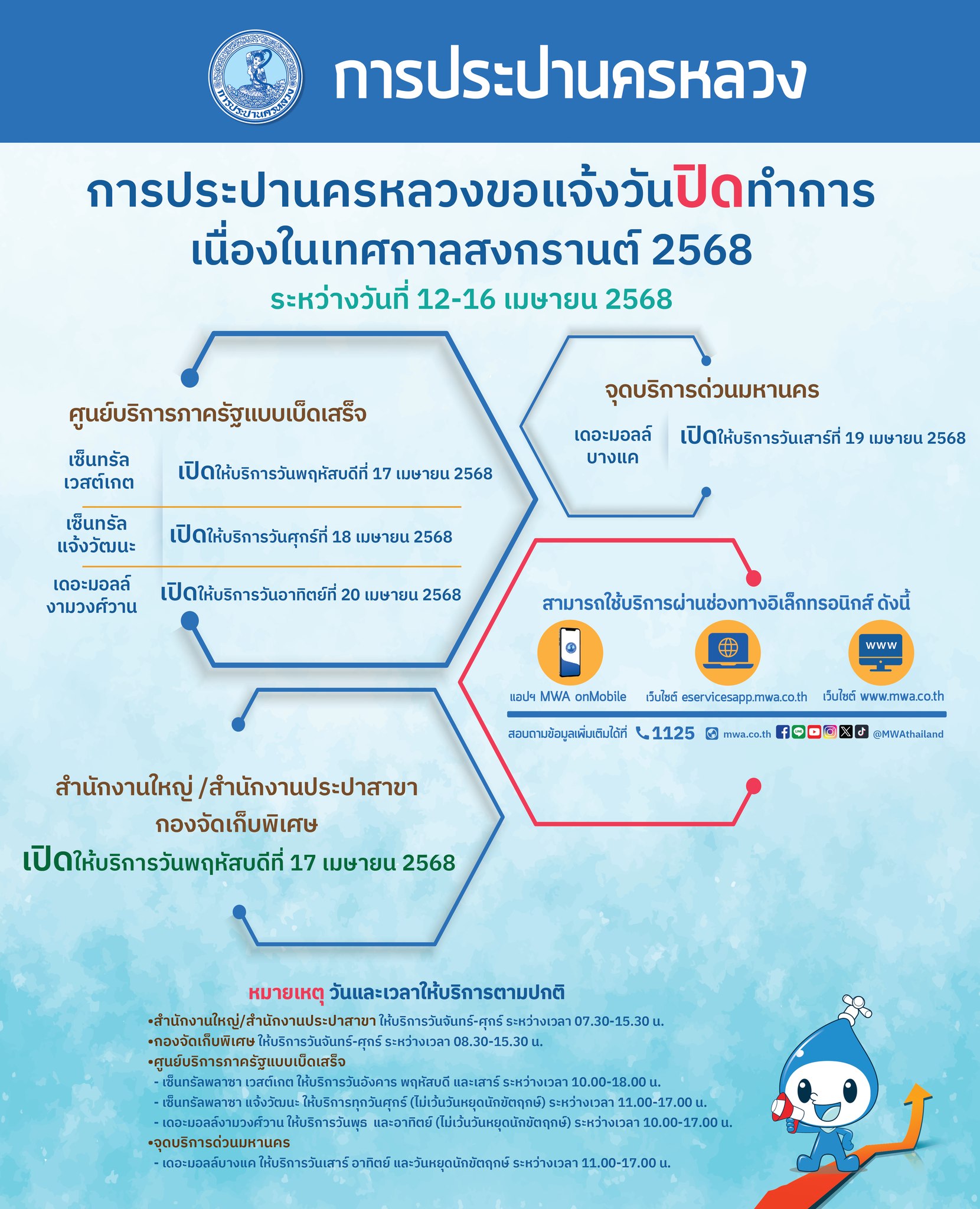 การประปานครหลวง แจ้งวันหยุดช่วงเทศกาลสงกรานต์ 2568