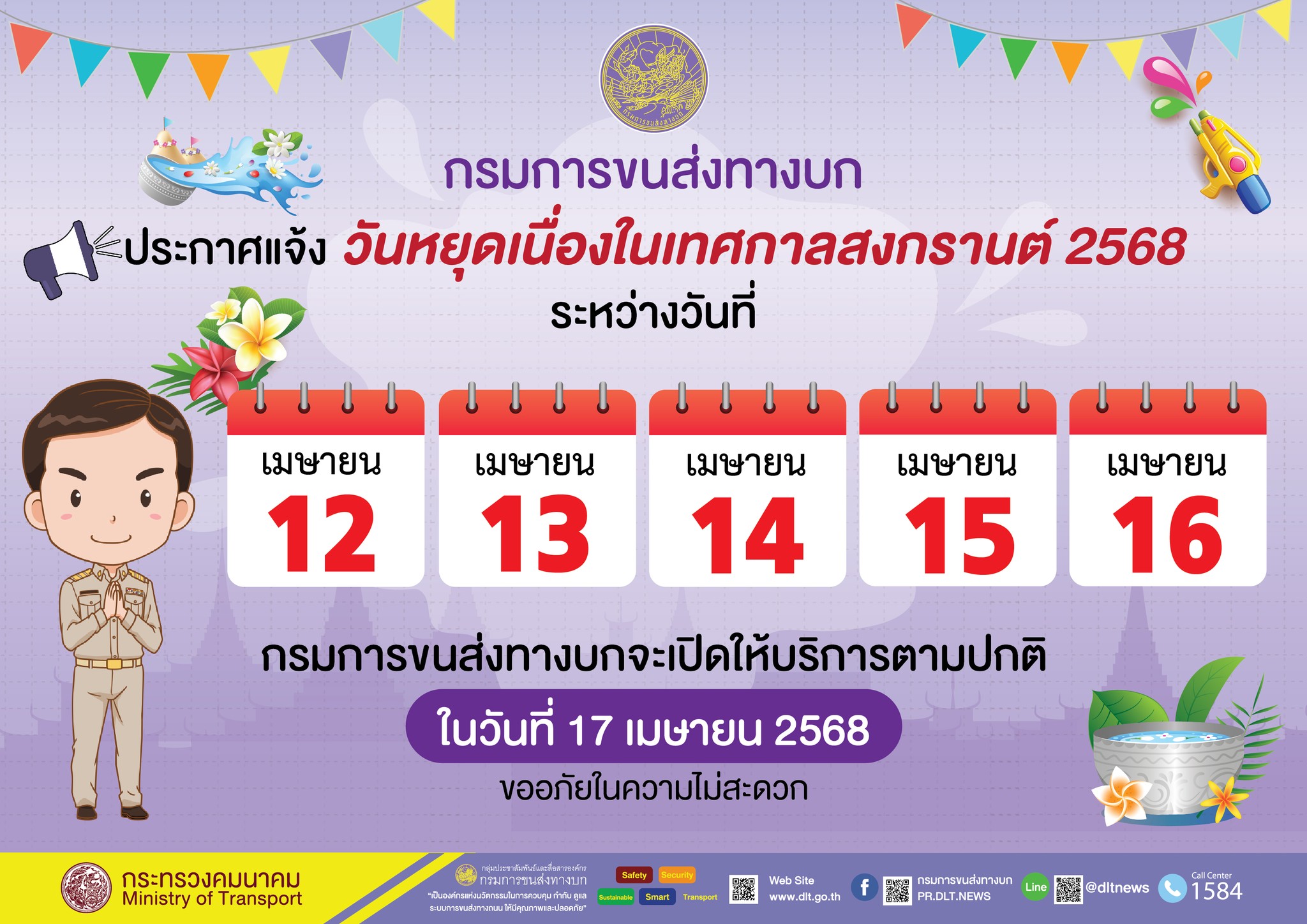 กรมการขนส่งทางบก ประกาศแจ้ง วันหยุดเนื่องในเทศกาลสงกรานต์ 2568 ระหว่างวันที่ 12 – 16 เมษายน 2568 โดยจะเปิดให้บริการตามปกติ วันที่ 17 เมษายน 2568
