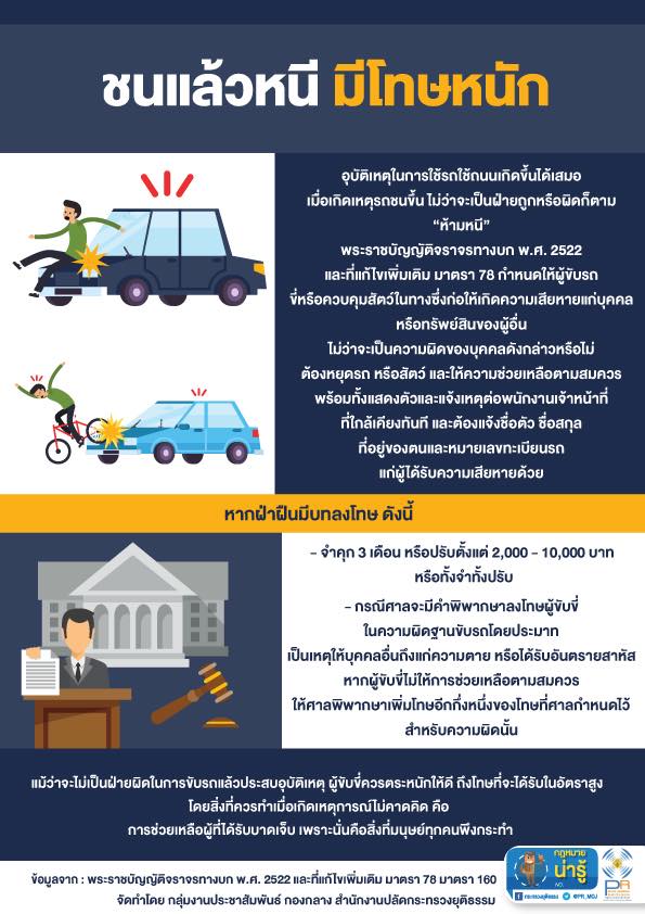 อุบัติเหตุในการใช้รถใช้ถนนเกิดขึ้นได้เสมอ เมื่อเกิดเหตุรถชนขึ้น ไม่ว่าจะเป็นฝ่ายถูกหรือผิดก็ตาม “ห้ามหนี” พระราชบัญญัติจราจรทางบก พ.ศ. 2522 และที่แก้ไขเพิ่มเติม มาตรา 78 กำหนดให้ผู้ขับรถ ขี่หรือควบคุมสัตว์ในทางซึ่งก่อให้เกิดความเสียหายแก่บุคคลหรือทรัพย์สินของผู้อื่น ไม่ว่าจะเป็นความผิดของบุคคลดังกล่าวหรือไม่ ต้องหยุดรถ หรือสัตว์ และให้ความช่วยเหลือตามสมควร พร้อมทั้งแสดงตัวและแจ้งเหตุต่อพนักงานเจ้าหน้าที่ที่ใกล้เคียงทันที และต้องแจ้งชื่อตัว ชื่อสกุล ที่อยู่ของตนและหมายเลขทะเบียนรถแก่ผู้ได้รับความเสียหายด้วย