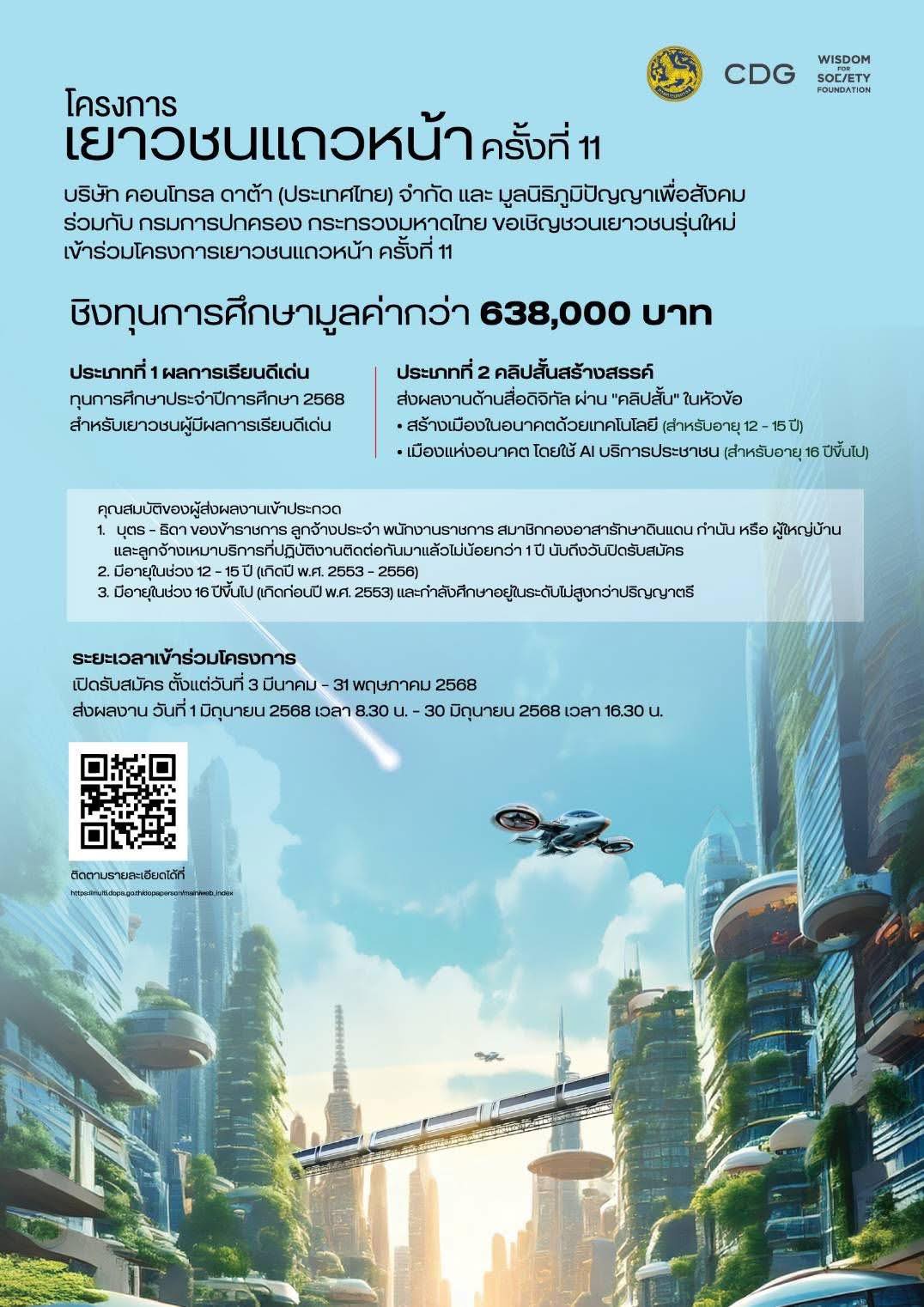 กรมการปกครอง ร่วมกับ บริษัคอนโทรล ดาต้า (ประเทศไทย) จำกัด ได้จัดทำโครงการเยาวชนแถวหน้า ครั้งที่ 11 โดยสนับสนุนทุนการศึกษาแก่บุตร – ธิดา ของบุคลากรในสังกัดกรมการปกครอง ด้วยการส่งผลการเรียนดีเด่น และ/หรือ ผลงานคลิปสั้นหัวข้อ “สร้างเมืองในอนาคตด้วยเทคโนโลยี” และ หัวข้อ “เมืองแห่งอนาคต โดยใช้ AI บริการประชาชน” เปิดรับสมัครตั้งแต่บัดนี้ – 30 พฤษภาคม 2568 โดยสามารถยื่นใบสมัครได้ที่ ที่ทำการปกครองจังหวัด และส่งผลงาน วันที่ 1 – 30 มิถุนายน 2568 (ภายในเวลา 16.30 น.)