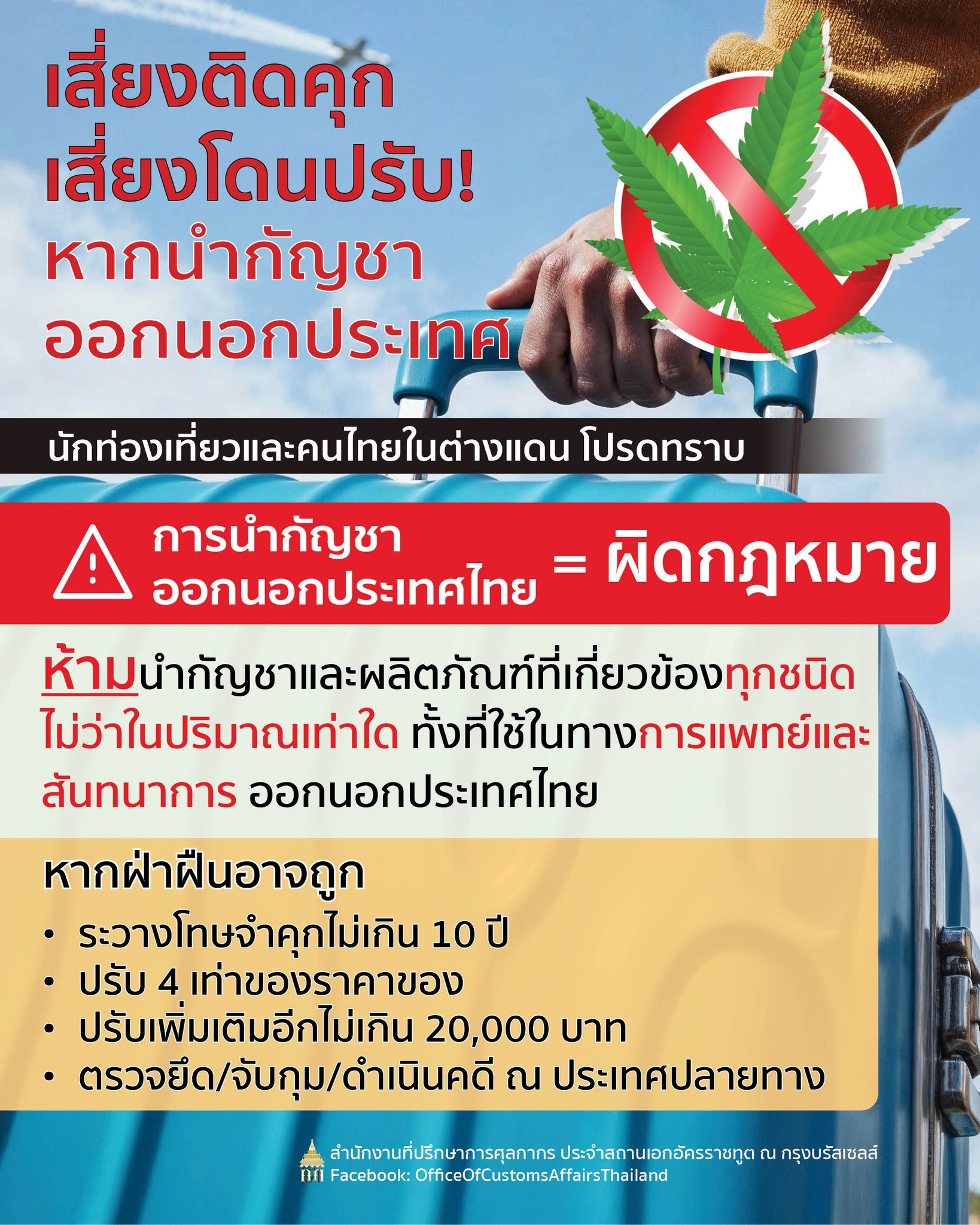 กรมศุลกากร แจ้งเตือนนักท่องเที่ยวและชาวไทยในต่างแดน ห้ามนำกัญชาและผลิตภัณฑ์ที่เกี่ยวข้องออกนอกประเทศไทย สำนักงานที่ปรึกษาการศุลกากร ณ กรุงบรัสเซลส์ ขอแจ้งเตือนนักท่องเที่ยวและพี่น้องชาวไทยในต่างแดน ว่าการนำกัญชาและผลิตภัณฑ์ที่เกี่ยวข้องออกนอกประเทศไทย ถือเป็นการกระทำผิดกฎหมาย ซึ่งรวมไปถึงกัญชาที่ใช้ในทางการแพทย์และสันทนาการ ไม่ว่าในปริมาณเท่าใดก็ตาม หากฝ่าฝืนอาจถูก ระวางโทษจำคุกไม่เกิน 10 ปี ปรับ 4 เท่าของราคาของ ปรับเพิ่มเติมอีกไม่เกิน 20,000 บาท ตรวจยึด/จับกุม/ดำเนินคดี ณ ประเทศปลายทาง