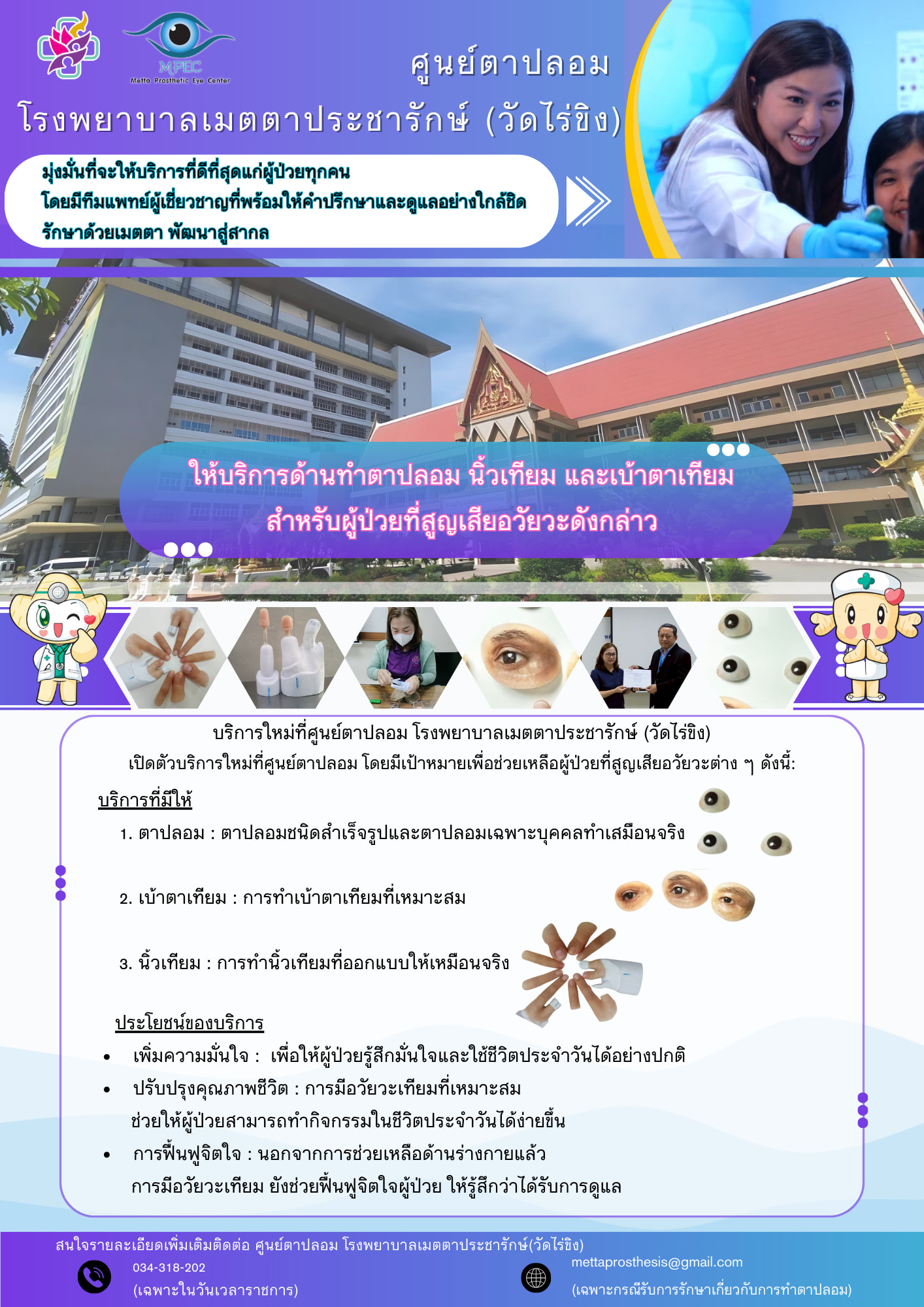 นายแพทย์กิตติวัฒน์ มะโนจันทร์ ผู้อำนวยการโรงพยาบาลเมตตาประชารักษ์ (วัดไร่ขิง) เปิดเผยว่า ทางโรงพยาบาลเล็งเห็นว่าการเข้าถึงอวัยวะเทียมควรเป็นสิ่งที่ผู้ป่วยทุกคนสามารถเข้ารับบริการจึงได้จัดตั้ง ศูนย์ตาปลอมขึ้นภายในโรงพยาบาล จนกระทั่งปัจจุบันได้ก้าวเข้าสู่ปีที่ 9 ของการดำเนินงาน ซึ่งได้ให้บริการผู้ป่วยเป็นจำนวน 2,402 ราย ทั้งนี้ศูนย์ตาปลอมมีบริการด้านตาปลอมสำเร็จรูป,ตาปลอมเฉพาะบุคคลเสมือนจริงและเบ้าตาเทียม ซึ่งทางศูนย์ได้เพิ่มบริการทำ “นิ้วเทียม” ขึ้นมาเพื่อช่วยเหลือผู้ป่วยที่สูญเสียอวัยวะดังกล่าว จากทีมบุคลากรทางการแพทย์ ที่ให้ความสำคัญทั้งด้านความเสมือนจริงและความสบายในการสวมใส่ โดยวัสดุที่ใช้ผลิตมีความยืดหยุ่น แข็งแรง ทนทาน และปรับแต่งให้เหมาะสมกับผู้ป่วย พร้อมเปิดให้คำปรึกษา ตรวจประเมิน และให้บริการอย่างครบวงจร ด้วยแพทย์ผู้เชี่ยวชาญเฉพาะทาง ที่มุ่งมั่นในการดูแลทั้งร่างกายและจิตใจของผู้ป่วยอย่างแท้จริง ให้มีความมั่นใจและสามารถใช้ชีวิตประจำวันในสังคมได้อย่างปกติ