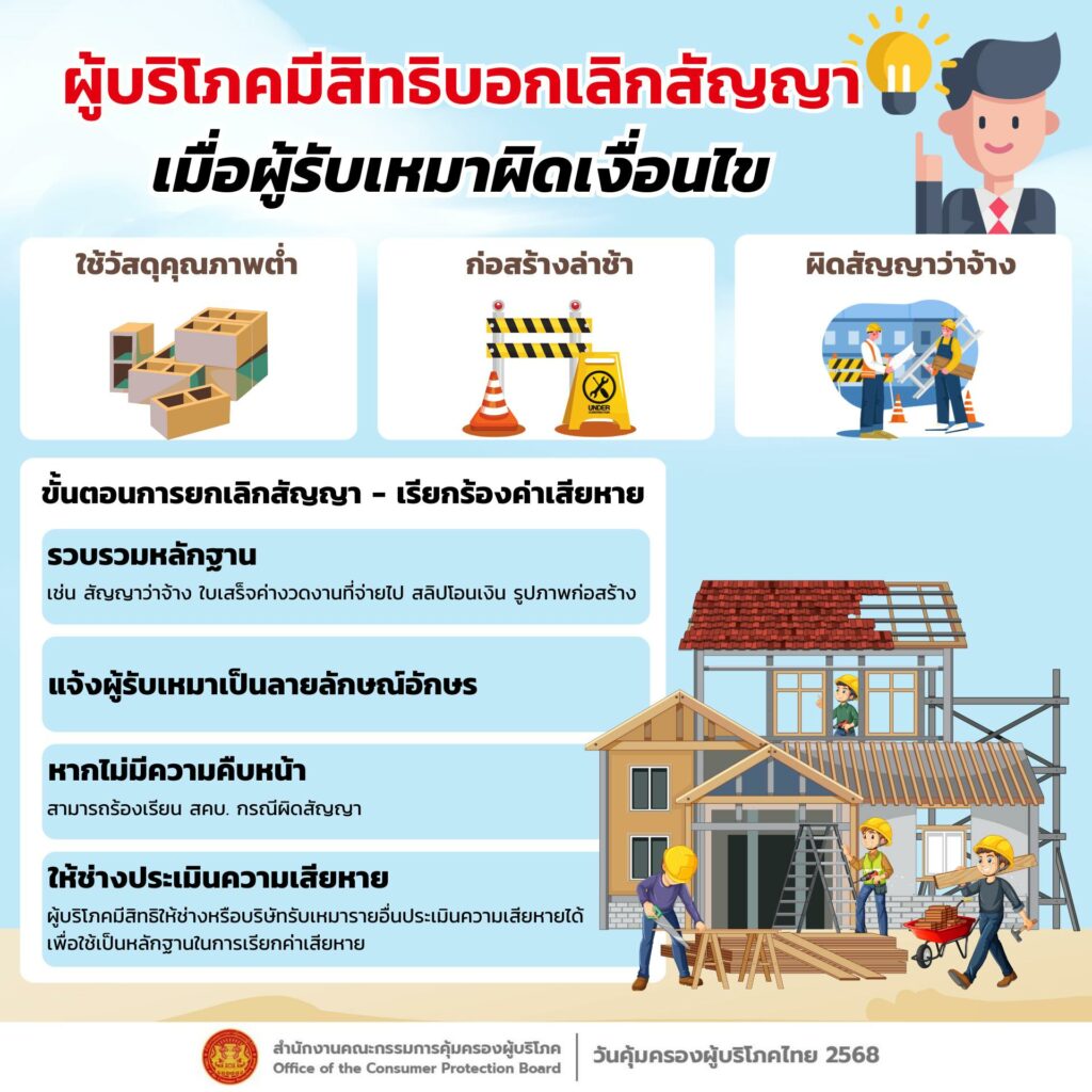 สคบ. เปิดเผย ผู้บริโภคมีสิทธิบอกเลิกสัญญา เมื่อผู้รับเหมาผิดเงื่อนไข