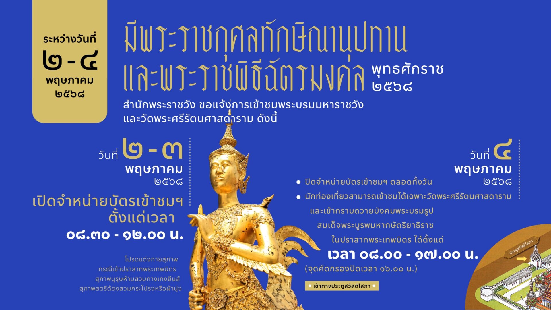 สำนักพระราชวัง ขอแจ้งการเข้าชมพระบรมมหาราชวังและวัดพระศรีรัตนศาสดาราม เนื่องในวันฉัตรมงคล ระหว่างวันที่ 2 – 4 พฤษภาคม 2568