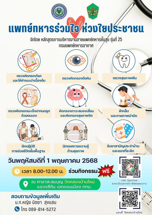 กรมแพทย์ทหารอากาศ จัดโครงการแพทย์ทหารร่วมใจ ห่วงใยประชาชน หลักสูตรการบริหารงานสายแพทย์ทหารชั้นสูง รุ่นที่ 25 กรมแพทย์ทหารอากาศ วันที่ 1 พฤษภาคม 2568 เวลา 08.00 – 12.00 น. ณ ศาลาสะสมบุญ วัดคลองบ้านใหม่ แขวงสีกัน เขตดอนเมือง กรุงเทพมหานคร สามารถลงทะเบียนเข้าร่วมกิจกรรมล่วงหน้าได้ทาง link คลิก