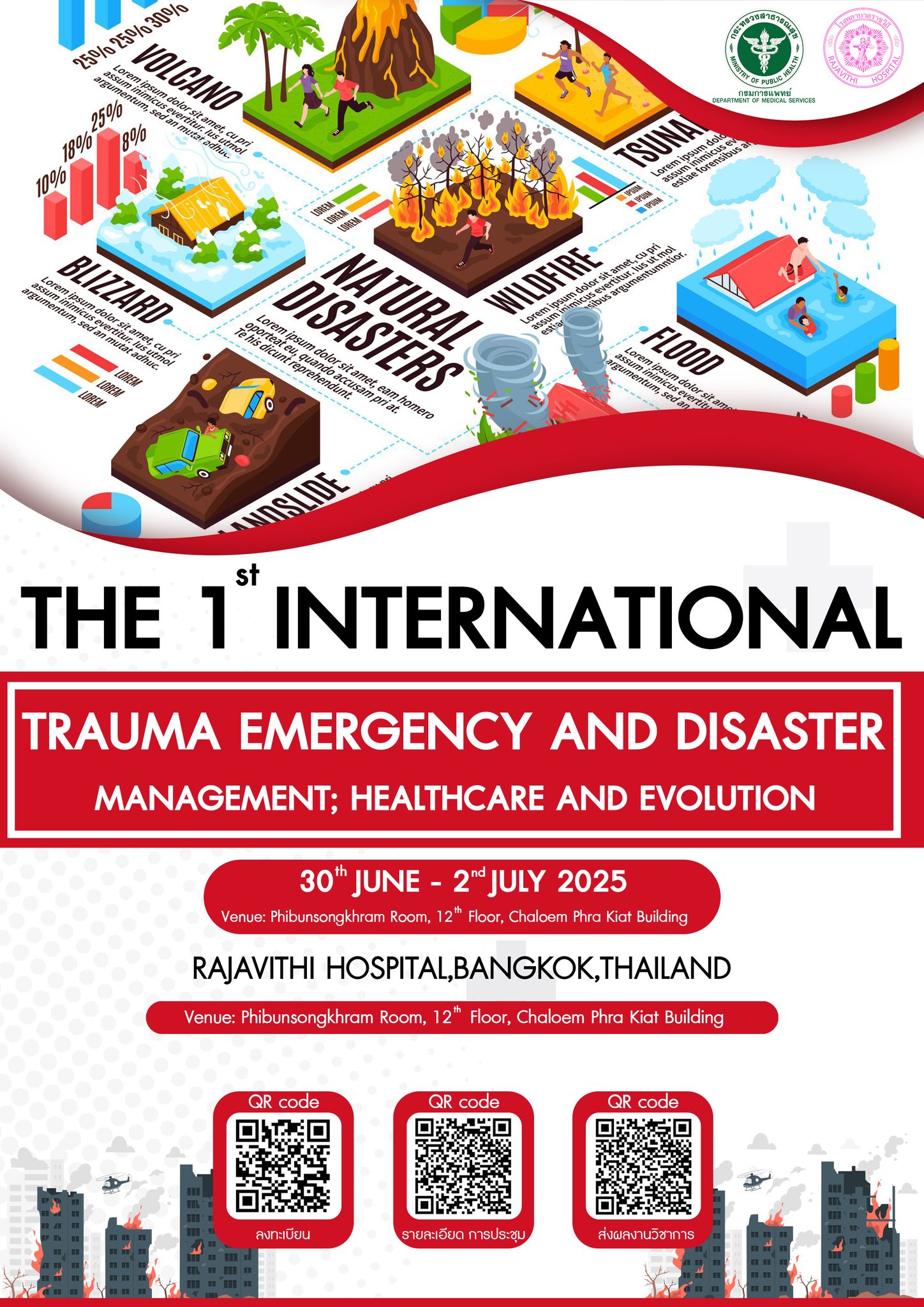 โรงพยาบาลราชวิถี ขอเชิญชวนบุคลากรทางการแพทย์ หน่วยงานภาครัฐ และเอกชน ตลอดจนผู้สนใจเข้าร่วมประชุมโครงการสัมมนาวิชาการระดับนานาชาติด้านอุบัติเหตุฉุกเฉินและสาธารณภัย ครั้งที่ 1 เพื่อแลกเปลี่ยนองค์ความรู้ด้านอุบัติเหตุฉุกเฉิน การจัดการภัยพิบัติ และการพัฒนาระบบบริการการแพทย์ฉุกเฉินกับผู้เชี่ยวชาญทั้งในและต่างประเทศ