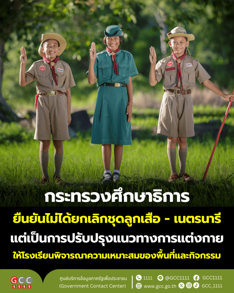 กระทรวงศึกษาธิการ ยืนยันว่า ไม่มีนโยบายยกเลิกเครื่องแบบลูกเสือ – เนตรนารี แต่เป็นการปรับปรุงแนวทางการแต่งกาย โดยเพิ่มทางเลือกให้สถานศึกษาสามารถพิจารณาได้ตามความเหมาะสมของบริบทพื้นที่และกิจกรรม ดังนั้น โรงเรียนจะสามารถพิจารณาว่าจะให้นักเรียนใส่ชุดลำลองหรือชุดลูกเสือปกติ