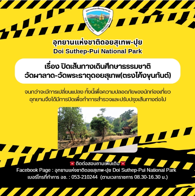 - อุทยานแห่งชาติดอยสุเทพ-ปุย แจ้งปิดเส้นทางเดินศึกษาธรรมชาติ วัดผาลาด-วัดพระธาตุดอยสุเทพ(ตรงโค้งขุนกันต์)