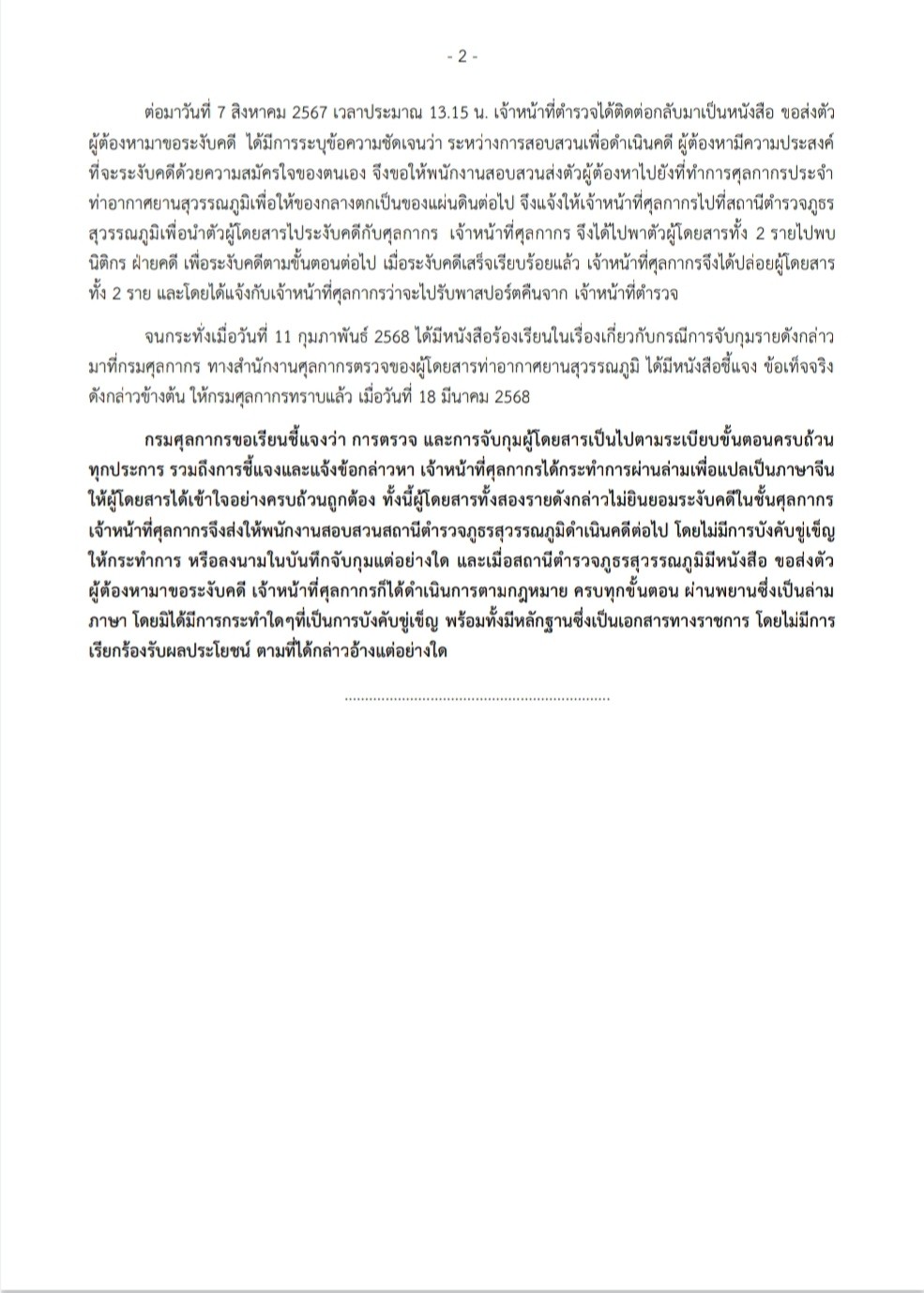 ต่อมาวันที่ 7 สิงหาคม 2567 เวลาประมาณ 13.15 น. เจ้าหน้าที่ตำรวจได้ติดต่อกลับมาเป็นหนังสือ ขอส่งตัวผู้ต้องหามาขอระงับคดี ได้มีการระบุข้อความชัดเจนว่า ระหว่างการสอบสวนเพื่อดำเนินคดี ผู้ต้องหามีความประสงค์ที่จะระงับคดีด้วยความสมัครใจของตนเอง จึงขอให้พนักงานสอบสวนส่งตัวผู้ต้องหาไปยังที่ทำการศุลกากรประจำท่าอากาศยานสุวรรณภูมิเพื่อให้ของกลางตกเป็นของแผ่นดินต่อไป จึงแจ้งให้เจ้าหน้าที่ศุลกากรไปที่สถานีตำรวจภูธรสุวรรณภูมิเพื่อนำตัวผู้โดยสารไประงับคดีกับศุลกากร เจ้าหน้าที่ศุลกากร จึงได้ไปพาตัวผู้โดยสารทั้ง 2 รายไปพบนิติกร ฝ่ายคดี เพื่อระงับคดีตามขั้นตอนต่อไป เมื่อระงับคดีเสร็จเรียบร้อยแล้ว เจ้าหน้าที่ศุลกากรจึงได้ปล่อยผู้โดยสารทั้ง 2 ราย และโดยได้แจ้งกับเจ้าหน้าที่ศุลกากรว่าจะไปรับพาสปอร์ตคืนจาก เจ้าหน้าที่ตำรวจ จนกระทั่งเมื่อวันที่ 11 กุมภาพันธ์ 2568 ได้มีหนังสือร้องเรียนในเรื่องเกี่ยวกับกรณีการจับกุมรายดังกล่าวมาที่กรมศุลกากร ทางสำนักงานศุลกากรตรวจของผู้โดยสารท่าอากาศยานสุวรรณภูมิ ได้มีหนังสือชี้แจง ข้อเท็จจริงดังกล่าวข้างต้น ให้กรมศุลกากรทราบแล้ว เมื่อวันที่ 18 มีนาคม 2568