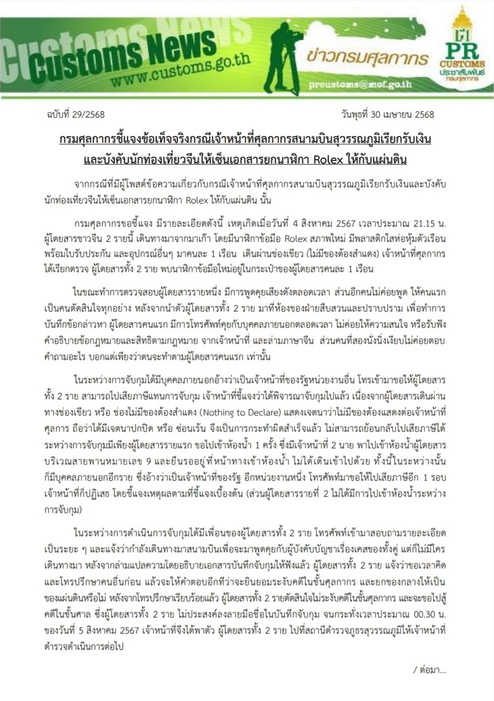 จากกรณีที่มีผู้โพสต์ข้อความเกี่ยวกับกรณีเจ้าหน้าที่ศุลกากรสนามบินสุวรรณภูมิเรียกรับเงินและบังคับนักท่องเที่ยวจีนให้เซ็นเอกสารยกนาฬิกา Rolex ให้กับแผ่นดิน นั้น