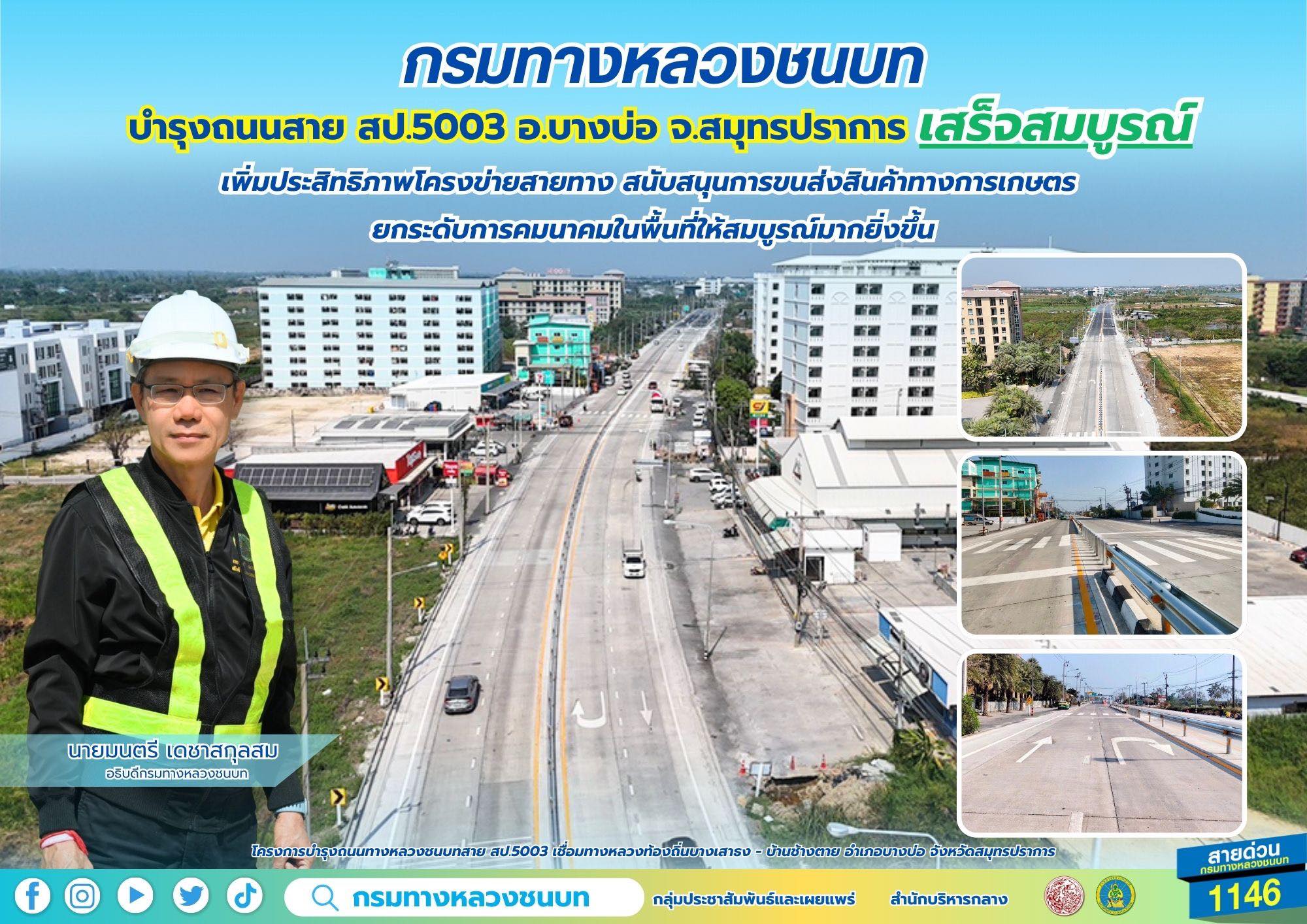 สำหรับโครงการก่อสร้างถนนทางหลวงชนบทสาย สป.5003 อ.บางบ่อ จ.สมุทรปราการ มีจุดเริ่มต้นจากถนนทางหลวงท้องถิ่นบางเสาธง แยกจาก ทล.34 (ถนนเทพรัตน) เข้าอำเภอบางเสาธง ไปบรรจบกับถนนท้องถิ่น เชื่อมถนนทางหลวงชนบทสาย ฉช.3001 เข้าสู่เขตลาดกระบัง กรุงเทพมหานคร และจังหวัดฉะเชิงเทรา โดยเริ่มดำเนินการตั้งแต่ช่วง กม.ที่ 3+159 ถึง กม.ที่ 3+810 รวมระยะทางดำเนินการ 0.651 กิโลเมตร ใช้งบประมาณทั้งสิ้น 18.790 ล้านบาท ซึ่งช่วยให้ประชาชนสัญจรและขนส่งผลผลิตทางการเกษตร สินค้าอุตสาหกรรมในพื้นที่ได้อย่างคล่องตัว พร้อมเสริมความแข็งแรงมั่นคงของผิวจราจร เพื่อรองรับปริมาณการจราจรที่จะเพิ่มมากขึ้น เพิ่มความสะดวกและปลอดภัยให้กับประชาชนเชื่อมต่อการเดินทางสู่ถนนสายหลักได้อย่างสมบูรณ์มากยิ่งขึ้น