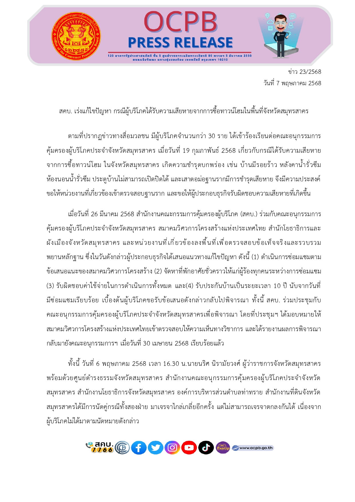 เมื่อวันที่ 26 มีนาคม 2568 สํานักงานคณะกรรมการคุ้มครองผู้บริโภค (สคบ.) ร่วมกับคณะอนุกรรมการ คุ้มครองผู้บริโภคประจําจังหวัดสมุทรสาคร สมาคมวิศวการโครงสร้างแห่งประเทศไทย สํานักโยธาธิการและ ผังเมืองจังหวัดสมุทรสาคร และหน่วยงานที่เกี่ยวข้องลงพื้นที่เพื่อตรวจสอบข้อเท็จจ ใจจริงและรวบรวม พยานหลักฐาน ซึ่งในวันดังกล่าวผู้ประกอบธุรกิจได้เสนอแนวทางแก้ไขปัญหา ดังนี้ (1) ดําเนินการซ่อมแซมตาม ข้อเสนอแนะของสมาคมวิศวการโครงสร้าง (2) จัดหาที่พักอาศัยชั่วคราวให้แก่ผู้ร้องทุกคนระหว่างการซ่อมแซม (3) รับผิดชอบค่าใช้จ่ายในการดําเนินการทั้งหมด และ (4) รับประกันบ้านเป็นระยะเวลา 10 ปี นับจากวันที่ มีซ่อมแซมเรียบร้อย เบื้องต้นผู้บริโภคขอรับข้อเสนอดังกล่าวกลับไปพิจารณา ทั้งนี้ สคบ. ร่วมประชุมกับ คณะอนุกรรมการคุ้มครองผู้บริโภคประจําจังหวัดสมุทรสาครเพื่อพิจารณา โดยที่ประชุมฯ ได้มอบหมายให้สมาคมวิศวการโครงสร้างแห่งประเทศไทยเข้าตรวจสอบให้ความเห็นทางวิชาการ และได้รายงานผลการพิจารณากลับมายังคณะอนุกรรมการฯ เมื่อวันที่ 30 เมษายน 2568 เรียบร้อยแล้ว
