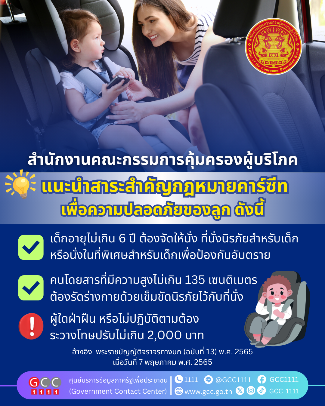 สำนักงานคณะกรรมการคุ้มครองผู้บริโภค แนะนำสาระสำคัญกฎหมายคาร์ซีท เพื่อความปลอดภัยของลูก ดังนี้