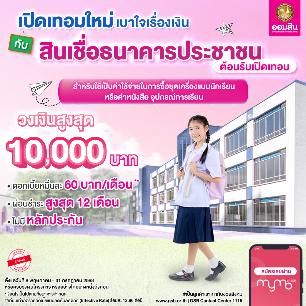 ธนาคารออมสิน จัดสินเชื่อต้อนรับเปิดเทอม ดอกเบี้ย 0.6% ต่อเดือน กู้สูงสุด 1 หมื่นบาท