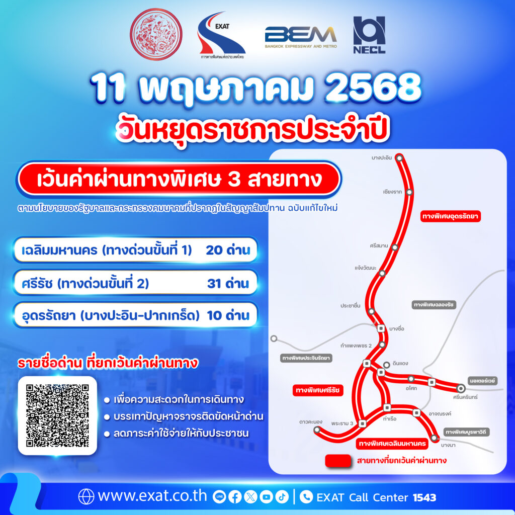 ทางด่วนฟรี : การทางพิเศษแห่งประเทศไทย ยกเว้นค่าผ่านทางพิเศษ 3 สายทาง วันที่ 11 พฤษภาคม 2568