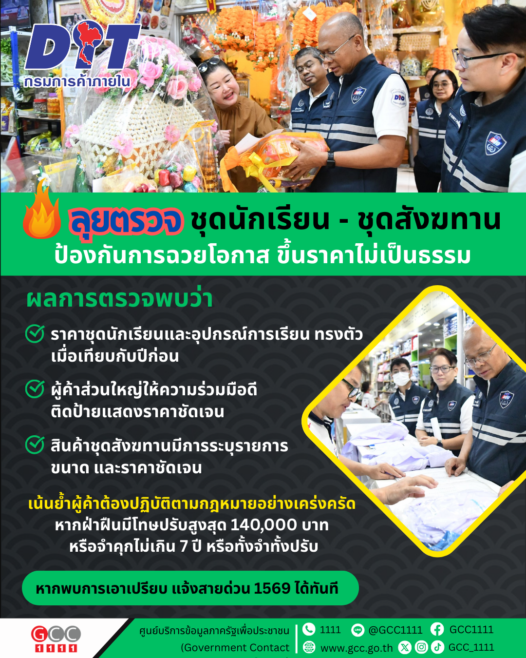 กรมการค้าภายใน ลุยตรวจชุดนักเรียน ชุดสังฆทาน ป้องกันฉวยโอกาสขึ้นราคาไม่เป็นธรรม โดยเน้นย้ำให้ผู้ค้าจำหน่ายสินค้า และปฏิบัติตามกฎหมายอย่างเคร่งครัด ในการปิดป้ายแสดงราคาสินค้า กรณีไม่แสดงราคาจำหน่ายปลีกสินค้าและค่าบริการ ต้องระวางโทษปรับไม่เกิน 10,000 บาท และหากจำหน่ายสินค้าและบริการในราคาสูงเกินสมควร มีความผิด ต้องระวางโทษจำคุกไม่เกิน 7 ปี หรือปรับไม่เกิน 140,000 บาท หรือทั้งจำทั้งปรับ เพื่อป้องกันไม่ให้ผู้ค้าฉวยโอกาสปรับขึ้นราคาสินค้าโดยไม่มีเหตุผลอันสมควร ประชาชนไม่ได้รับความเป็นธรรมในการซื้อสินค้าหรือใช้บริการ สามารถร้องเรียนได้ที่ สายด่วน 1569