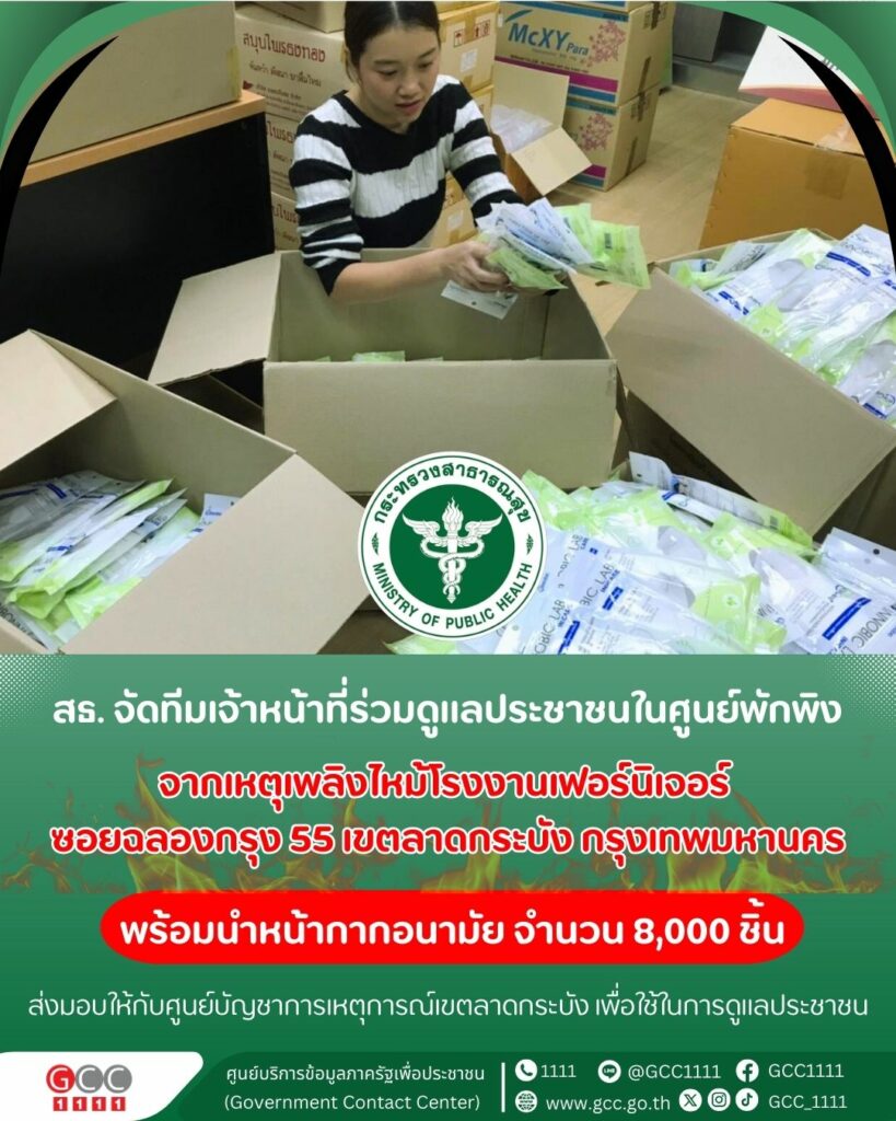 กระทรวงสาธารณสุข จัดทีมเจ้าหน้าที่จากกรมควบคุมโรคและกรมอนามัย ร่วมดูแลประชาชนในศูนย์พักพิงจากเหตุเพลิงไหม้โรงงานเฟอร์นิเจอร์ ซอยฉลองกรุง 55 เขตลาดกระบัง