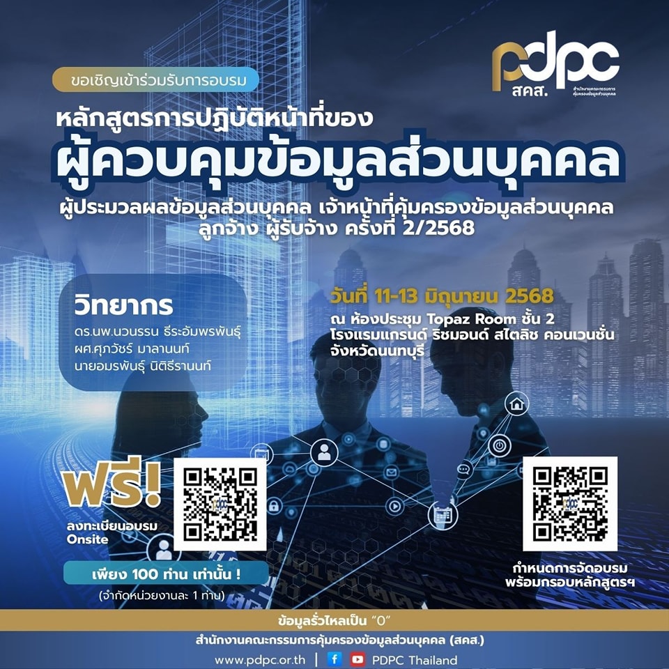 PDPC ขอเรียนเชิญเจ้าหน้าที่คุ้มครองข้อมูลส่วนบุคคลหรือผู้ที่เกี่ยวข้องของหน่วยงานภาคเอกชนที่มีความสนใจในการพัฒนาความรู้ ความเข้าใจด้านการคุ้มครองข้อมูลส่วนบุคคล เข้าร่วมอบรมมหลักสูตรการปฏิบัติหน้าที่ของผู้ควบคุมข้อมูลส่วนบุคคล ผู้ประมวลผลข้อมูลส่วนบุคคล เจ้าหน้าที่คุ้มครองข้อมูลส่วนบุคคล ลูกจ้าง ผู้รับจ้าง ครั้งที่ 2/2568