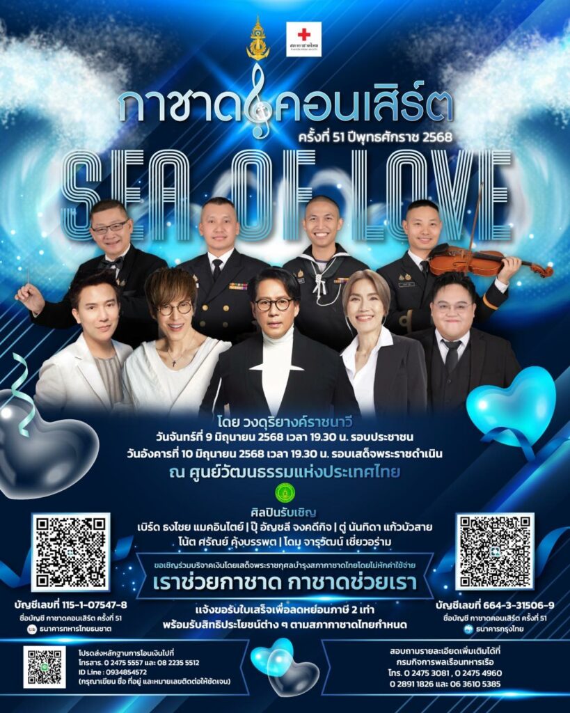 กองทัพเรือ ร่วมกับ สภากาชาดไทย กำหนดจัดการแสดงกาชาดคอนเสิร์ต ครั้งที่ 51 ปีพุทธศักราช 2568 ชื่อชุดการแสดงว่า “SEA OF LOVE” ในวันจันทร์ที่ 9 มิถุนายน 2568 และวันอังคารที่ 10 มิถุนายน 2568 เวลา 19.30 น. ณ ศูนย์วัฒนธรรมแห่งประเทศไทย บรรเลงโดยวงซิมโฟนีออร์เคสตรา วงดุริยางค์ราชนาวี นักร้องรับเชิญที่มีชื่อเสียง อาทิ อัญชลี จงคดีกิจ ธงไชย แมคอินไตย์ นันทิดา แก้วบัวสาย จารุวัฒน์ เชี่ยวอร่าม และ ศรัณย์ คุ้งบรรพต ร่วมด้วย นักร้องจากวงดุริยางค์ราชนาวี