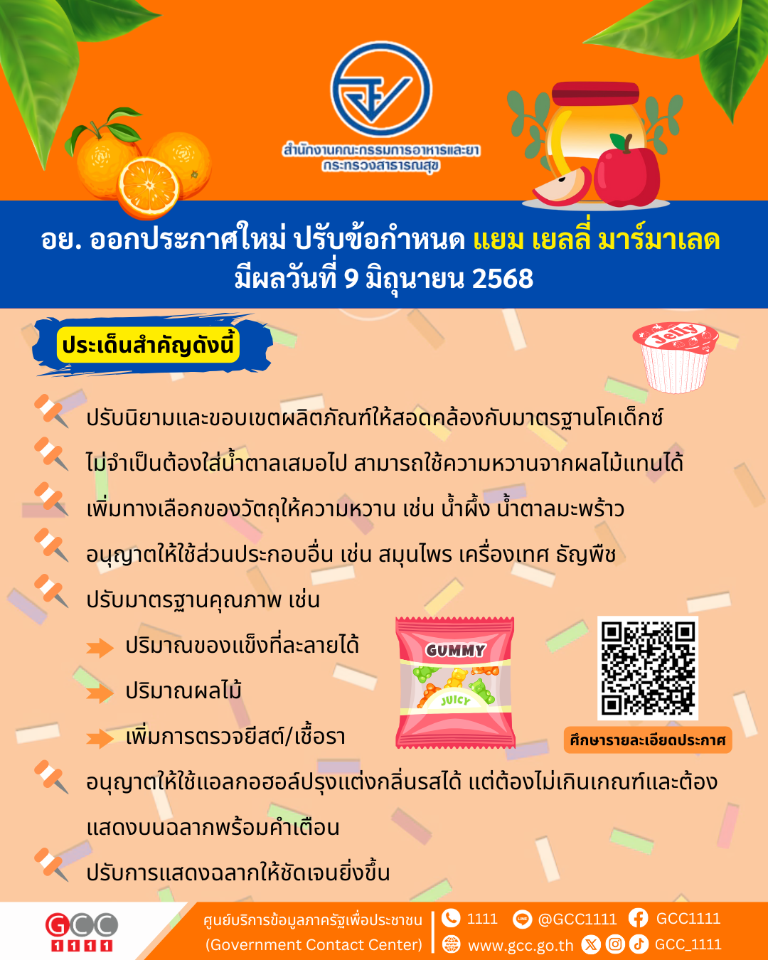 สำนักงานคณะกรรมการอาหารและยา ออกกฎหมายใหม่ ปรับข้อกำหนด แยม-เยลลี่-มาร์มาเลด ให้สอดคล้องมาตรฐานโคเด็กซ์ เพิ่มทางเลือกความหวานและส่วนประกอบ และปรับการแสดงฉลาก โดยมีผลวันที่ 9 มิถุยายน 2568