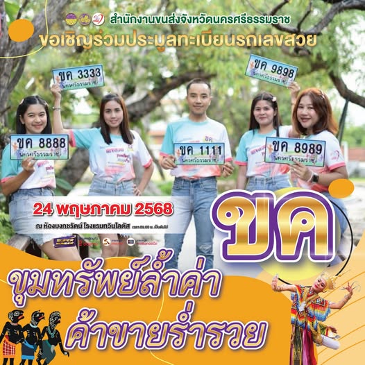 สำนักงานขนส่งจังหวัดนครศรีธรรมราช ขอเชิญร่วมงานประมูลทะเบียนรถเลขสวย หมวดอักษร ขค วันที่ 24 พ.ค.68