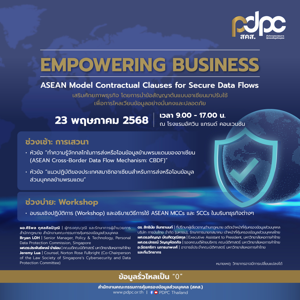 สำนักงานคณะกรรมการคุ้มครองข้อมูลส่วนบุคคล (สคส.) หรือ PDPC ขอเชิญเข้าร่วมการอบรมเชิงปฏิบัติการ (Workshop) ASEAN’S MCCs “โครงการพัฒนากฎหมายด้านการคุ้มครองข้อมูลส่วนบุคคลของประเทศภายใต้กิจกรรมที่ 1 พัฒนากฎหมายด้านการคุ้มครองข้อมูลส่วนบุคคลในระดับสากล”