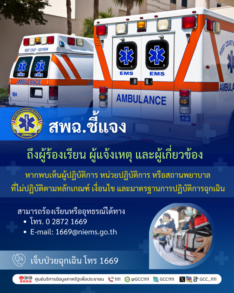• สถาบันการแพทย์ฉุกเฉินแห่งชาติ (สพฉ.) ชี้แจง ถึงผู้ร้องเรียน ผู้แจ้งเหตุ และผู้เกี่ยวข้อง