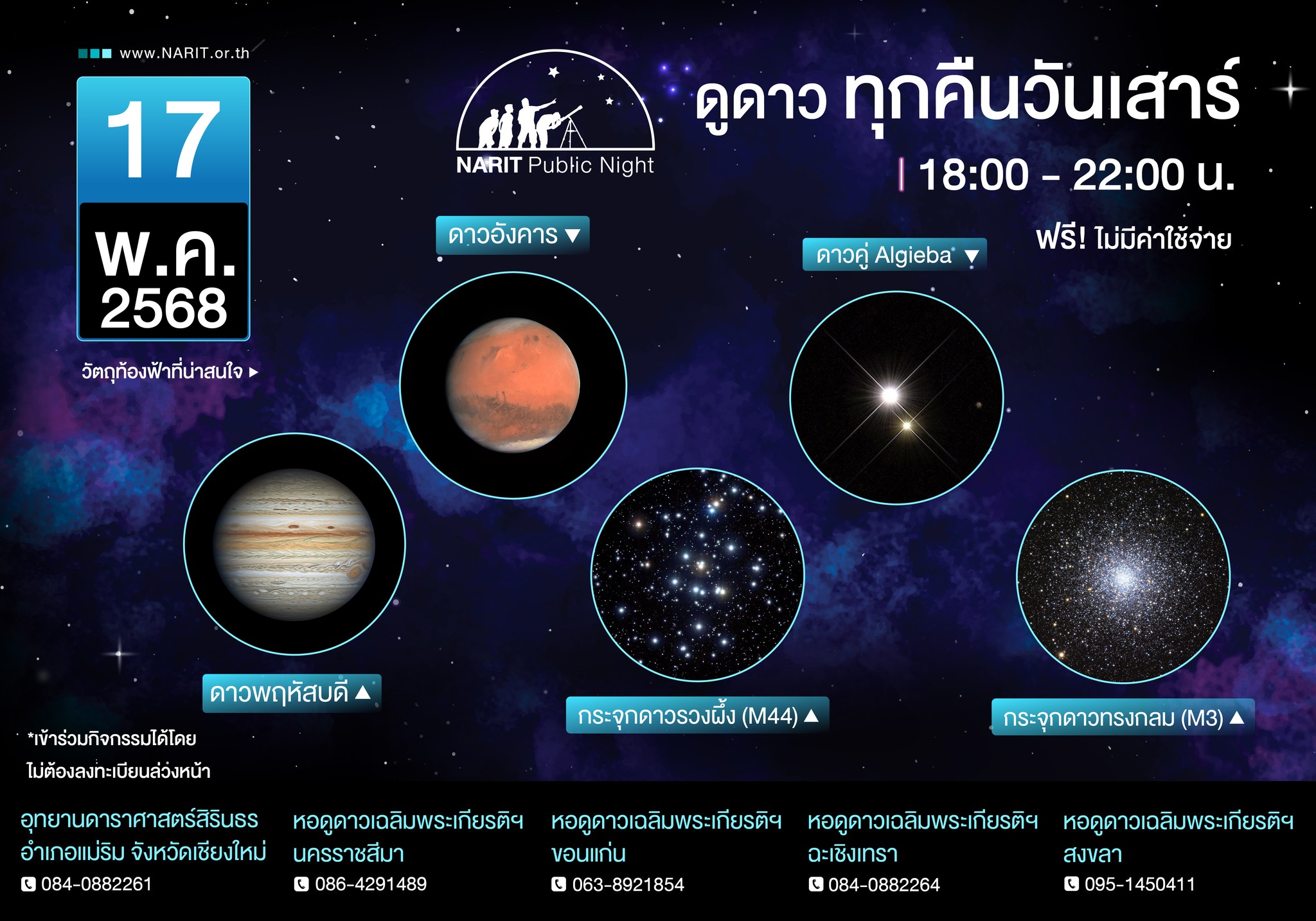 สถาบันวิจัยดาราศาสตร์แห่งชาติ ชวนร่วมกิจกรรม NARIT Public Night ฟรี วันที่ 17 พฤษภาคม 2568 เวลา 18.00 – 22.00 น. ณ หอดูดาวภูมิภาคสำหรับประชาชน 5 แห่ง