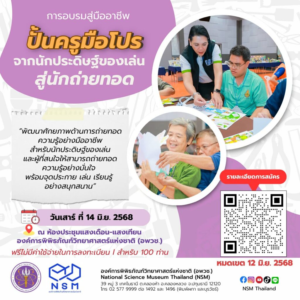 อพวช. เชิญเข้าร่วมอบรมหลักสูตร “ปั้นครูมือโปร: จากนักประดิษฐ์ของเล่นวิทยาศาสตร์สู่นักถ่ายทอด (Science Toy Pro-Trainer Workshop: Empowering Makers to Teach)”