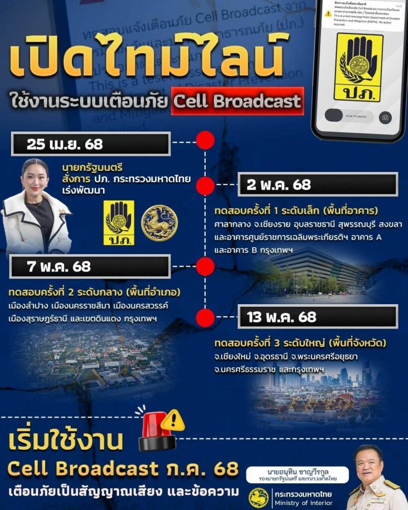 น.ส.ไตรศุลี กล่าวว่า สำหรับการดำเนินการของกระทรวงมหาดไทยในระยะที่ผ่านมา นายอนุทิน ชาญวีรกูล รองนายกรัฐมนตรี และ รมว.มหาดไทย ในฐานะผู้บัญชาการป้องกันและบรรเทาสาธารณภัยแห่งชาติ ได้เห็นชอบให้ ปภ. ร่วมกับกระทรวงดิจิทัลเพื่อเศรษฐกิจและสังคม สำนักงานคณะกรรมการกิจการกระจายเสียง กิจการโทรทัศน์ และกิจการโทรคมนาคมแห่งชาติ (กสทช.) กรมประชาสัมพันธ์ และผู้ให้บริการเครือข่ายโทรศัพท์เคลื่อนที่ 3 ราย ทำการทดสอบระบบแจ้งเตือนภัย Cell Broadcast ใน 3 ระดับ 4 ภูมิภาค รวม 15 พื้นที่ ประกอบด้วย วันที่ 2 พฤษภาคม 2568 เวลา 13.00 น. ทดสอบระดับเล็ก (พื้นที่อาคาร) ในบริเวณ ศาลากลางจังหวัดเชียงราย ศาลากลางจังหวัดสุพรรณบุรี ศาลากลางจังหวัดอุบลราชธานี ศาลากลางจังหวัดสงขลา และอาคารศูนย์ราชการเฉลิมพระเกียรติฯ แจ้งวัฒนะ อาคาร A และอาคาร B กรุงเทพฯ