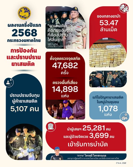 - ผลงานครึ่งปีแรก 2568 มหาดไทย การป้องกันและปราบปรามยาเสพติด