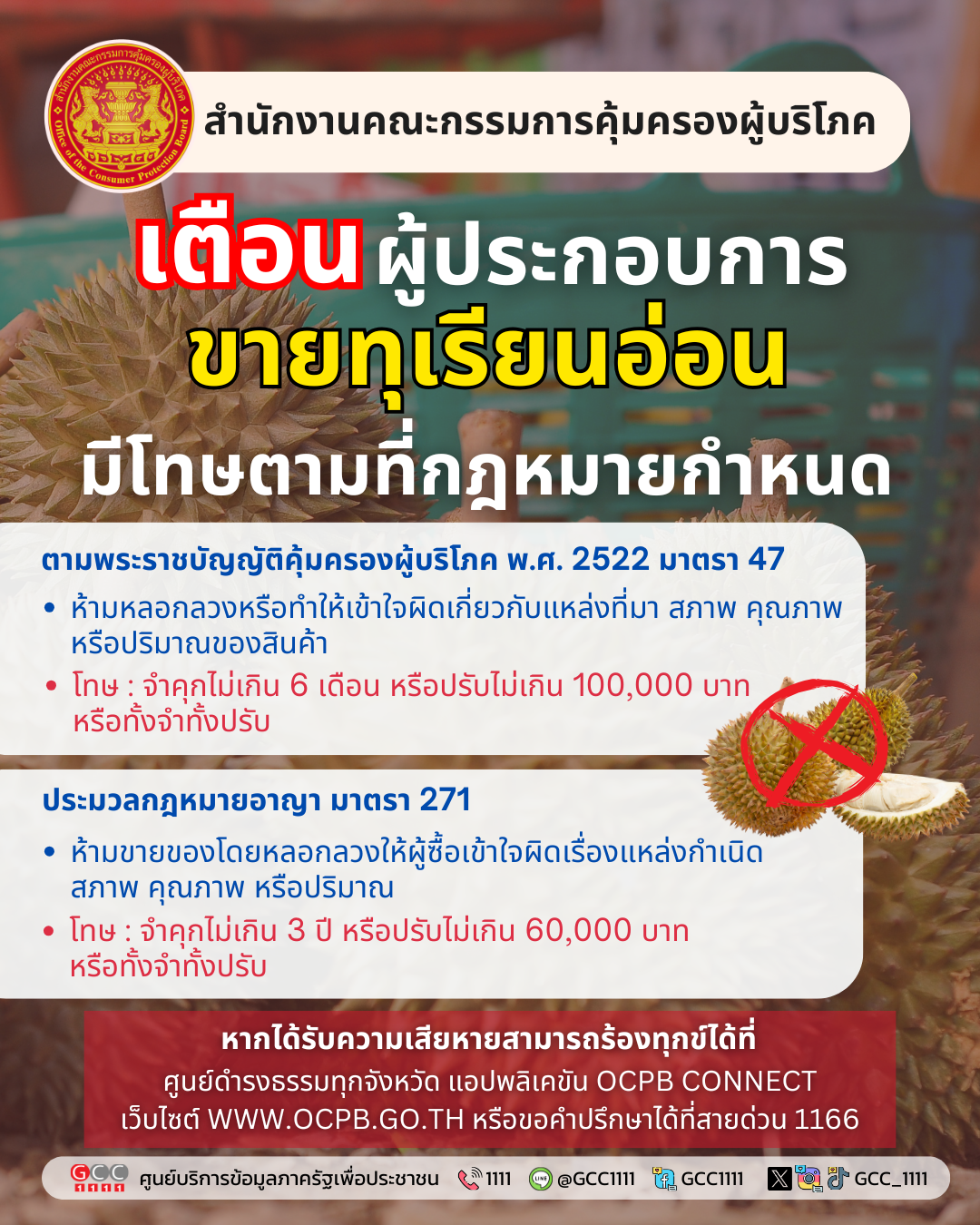 สำนักงานคณะกรรมการคุ้มครองผู้บริโภค แจ้งเตือนผู้ประกอบการขายทุเรียนอ่อน มีโทษตามที่กฎหมายกำหนด ดังนี้ ตามพระราชบัญญัติคุ้มครองผู้บริโภค พ.ศ. 2522 มาตรา 47 ผู้ใดเจตนาโดยก่อให้เกิดเข้าใจผิดเกี่ยวกับแหล่งที่มา สภาพ ปริมาณ หรือคุณภาพของสินค้า หรือใช้ข้อความโฆษณาที่เป็นเท็จหรือชวนให้เข้าใจผิด ต้องระวางโทษจำคุกไม่เกินหกเดือน หรือปรับไม่เกินหนึ่งแสนบาท หรือทั้งจำทั้งปรับ ตามประมวลกฎหมายอาญา มาตรา 271 ผู้ใดขายของโดยหลอกลวงด้วยประการใดๆ ให้ผู้ซื้อหลงเชื่อในแหล่งกำเนิด สภาพ คุณภาพหรือปริมาณแห่งของนั้นอันเป็นเท็จ ถ้าการกระทำนั้นไม่เป็นความผิดฐาน ฉ้อโกง ต้องระวางโทษจำคุกไม่เกินสามปี หรือปรับไม่เกินหกหมื่นบาท หรือทั้งจำทั้งปรับ และหากได้รับความเสียหายจากกรณีการหลอกขายทุเรียนอ่อนสามารถแจ้งความเพื่อดำเนินคดีได้ที่ สถานีตำรวจในท้องที่ทุกแห่ง หรือร้องทุกข์ได้ที่ศูนย์ดำรงธรรมทุกจังหวัด แอปพลิเคชัน : OCPB Connect เว็บไซต์ : คลิกที่นี่   โทร. 1166